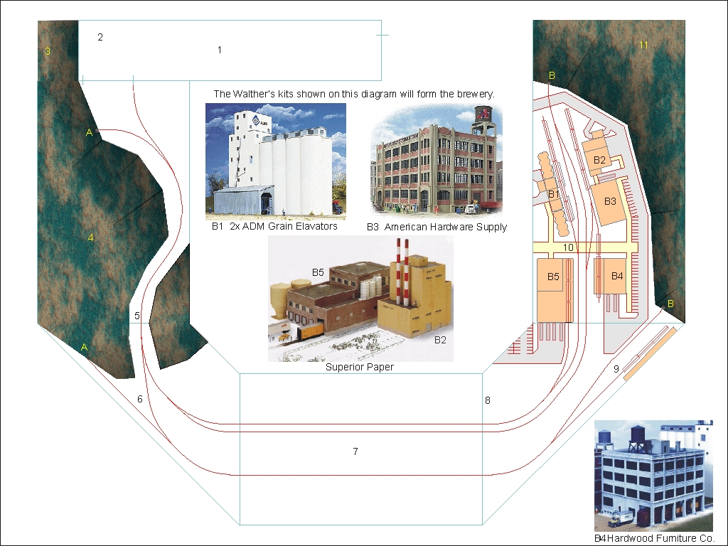The brewery will consist of five buildings. Building 1(labeled B1 in the layout diagram) is a grain elevator for receiving some of the ingredients. It is going to be kit bashed out of two Walther�s ADM Grain Elevators. Building 2 is the brew house. It will be built with one of the buildings from Walther�s Superior Paper kit. Building 3 is the fermentation house. Walther�s American Hardware Supply kit will be used here. Building 4 is the bottling plant. Walther�s Hardwood Furniture Company will be used in this location. Building 5 is the warehouse. The other building from the Walther�s Superior Paper kit will be used as the warehouse. There will be piping or conveyors connecting the buildings together.