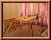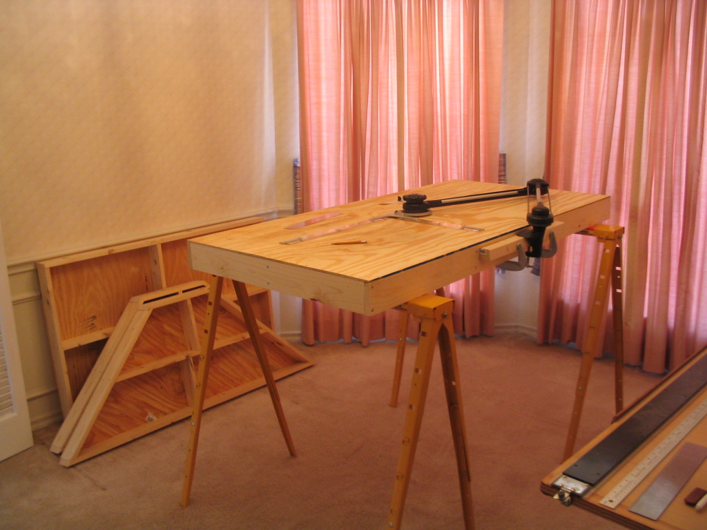 I moved the modules into the room where they will eventually sit as a finished layout. I set up a couple sawhorses so I could comfortably work on them. This picture shows the largest module ready for me to draw the track centerlines. I mounted a drafting arm to the side of the module to aid me. The rulers attached to the arm will remain at the same angle, no matter where I move them.