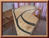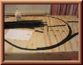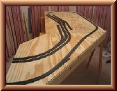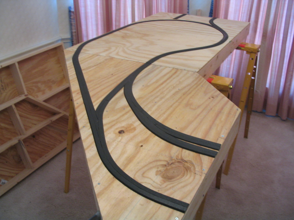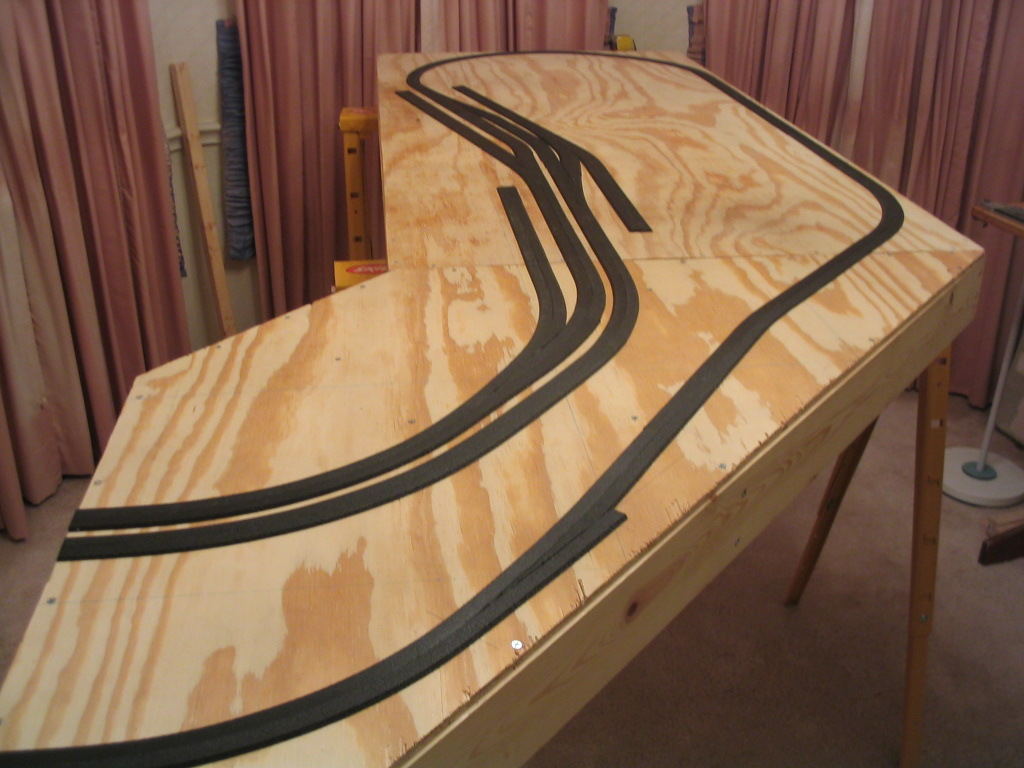 The roadbed for the track has been laid. This part went quicker than I thought. I used a foam roadbed product by Woodland Scenics. The roadbed comes perforated down the middle so it can be split in half if desired. I split the roadbed pieces so it would be easier to line up with the track center lines I drew on the plywood. I cut the pieces to size to ft the location if needed. I applied Elmer�s glue to the bottom of a piece and placed it on the plywood following the track centerline. I was easily able to get the roadbed to follow curves. For turnout locations, I had to cut the roadbed in odd angles to get it to form the turnout shape.