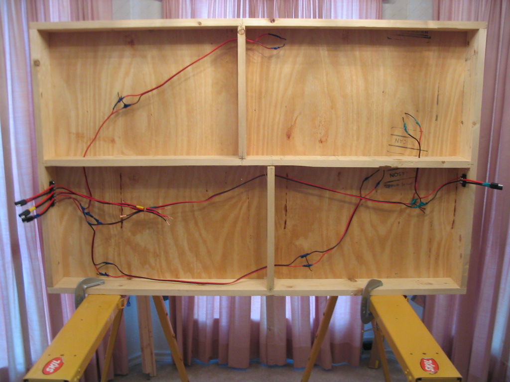 The wiring was not too hard, but it took a while. First, I soldered three inch 18 awg. wire feeders to the track. The trick to this was soldering quick enough to avoid melting the plastic ties. I soldered the feeders to 14 awg. bus wire. I connected the bus wire to terminal strips on either side of the module. I attached connectors to the terminal strips. I used a meter to check for short circuits in each circuit on each module as I was wiring them. I distinguished the different circuits using colored electrical tape.