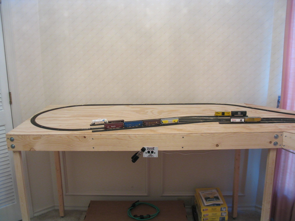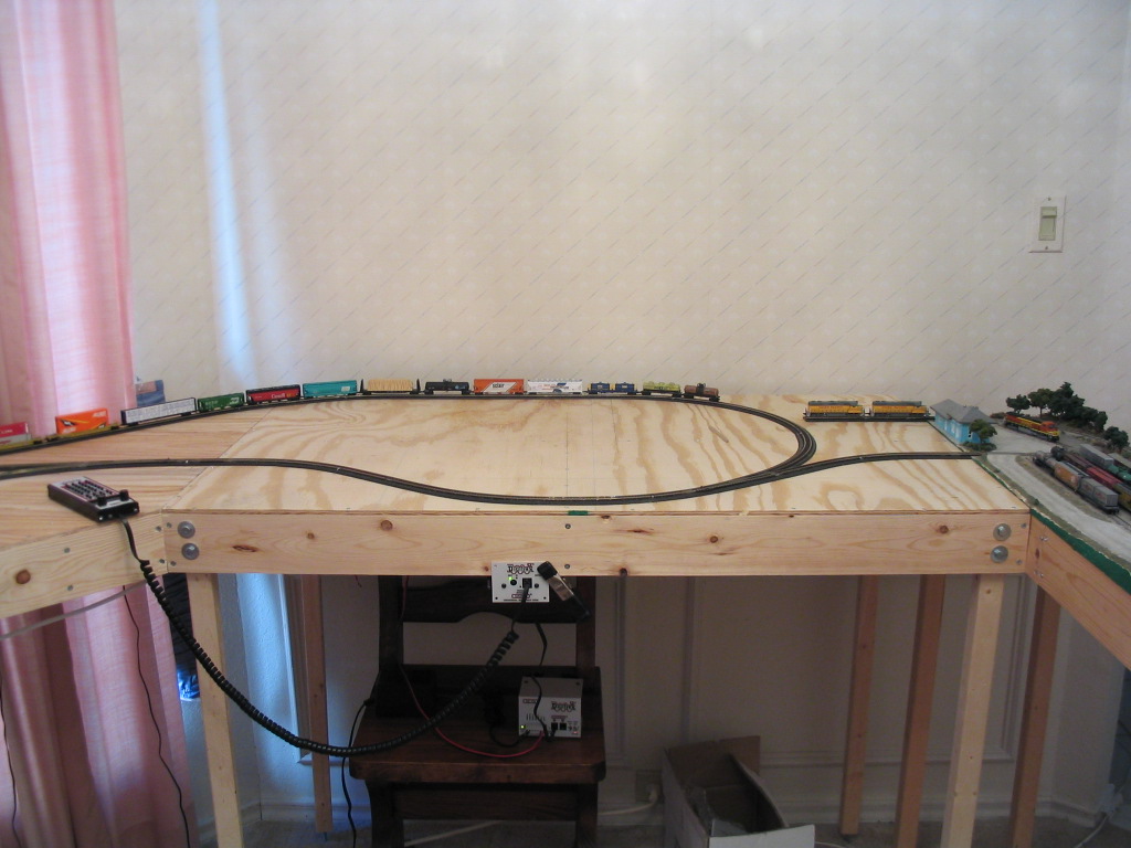 I checked each circuit for short circuits. Now it was time to attach the Digitrax controller. The Digitrax circuit board I talked about previously in the electrical section is back ordered, so I connected the yard, and two main line circuits straight to the controller temporarily. I will not be able to use the reversing track until the board is delivered. I turned on the controller, placed a locomotive on the track, and successfully ran it all the way around the loop. I tested each siding. I also ran a full train around several times. Now I need to test the track for a while. I have had to fix a couple problems with track alignment already.