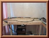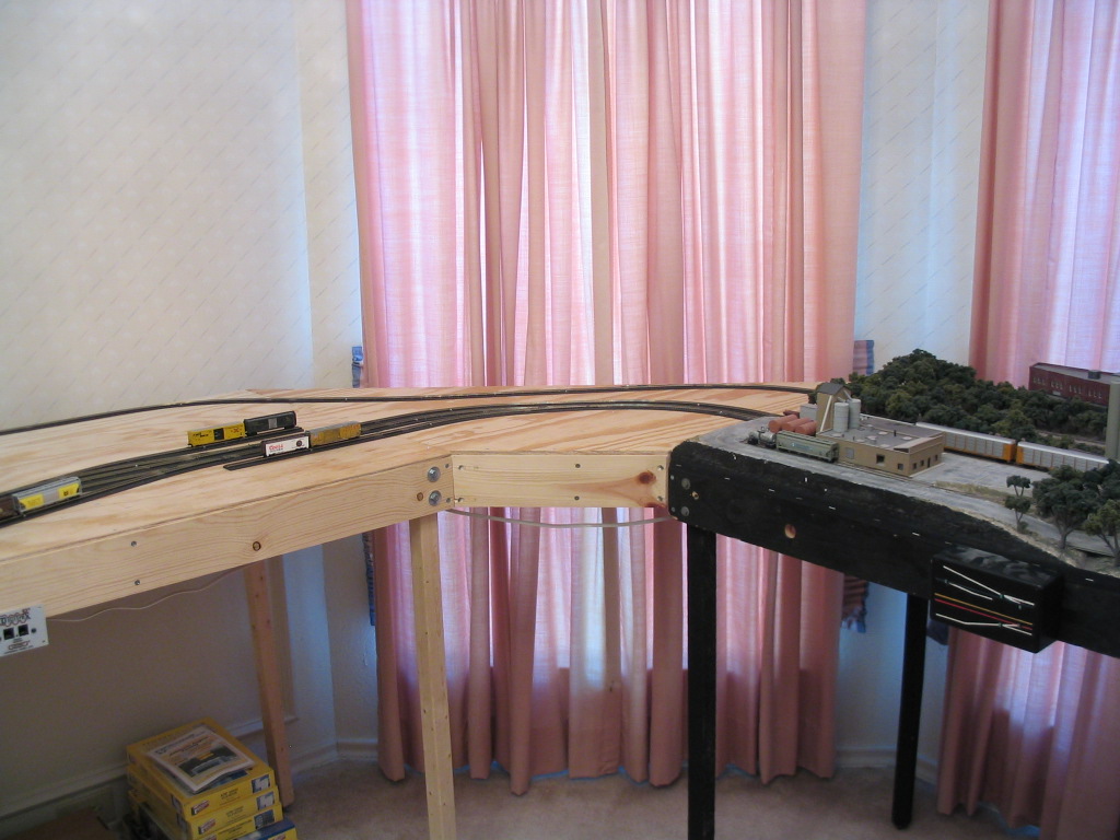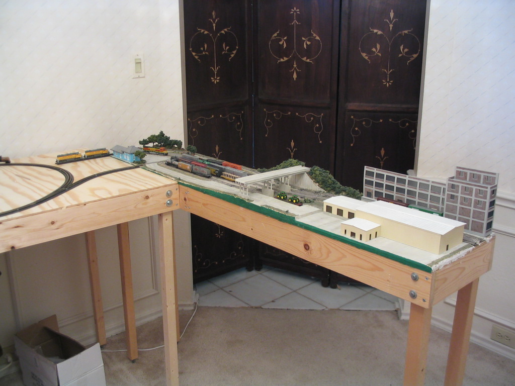 After I attached the legs to each of the two straight modules I moved them out of the room. I cleared the rest of the room and vacuumed. I then attached the legs to the original NTRAK module and lined it up in the room and leveled it. I temporarily attached two yard legs to a corner module using clamps. I lined the corner module up with the NTRAK module and clamped them together. I them made sure it was level. I then moved one of the new straight modules in place. I lined it up with the corner module, leveled it, and clamped them together. I removed the legs from the corner module them repeated the same steps with the corner and straight modules on the other side. I placed the yard in place last.