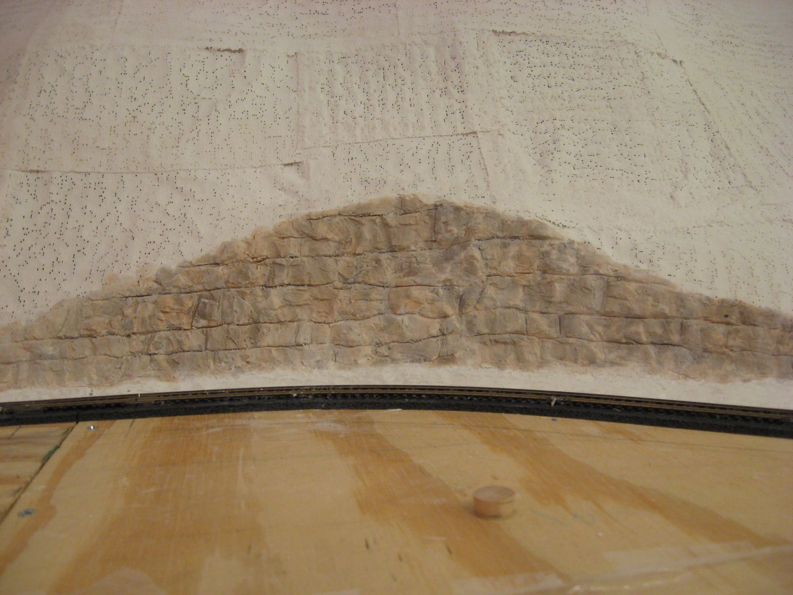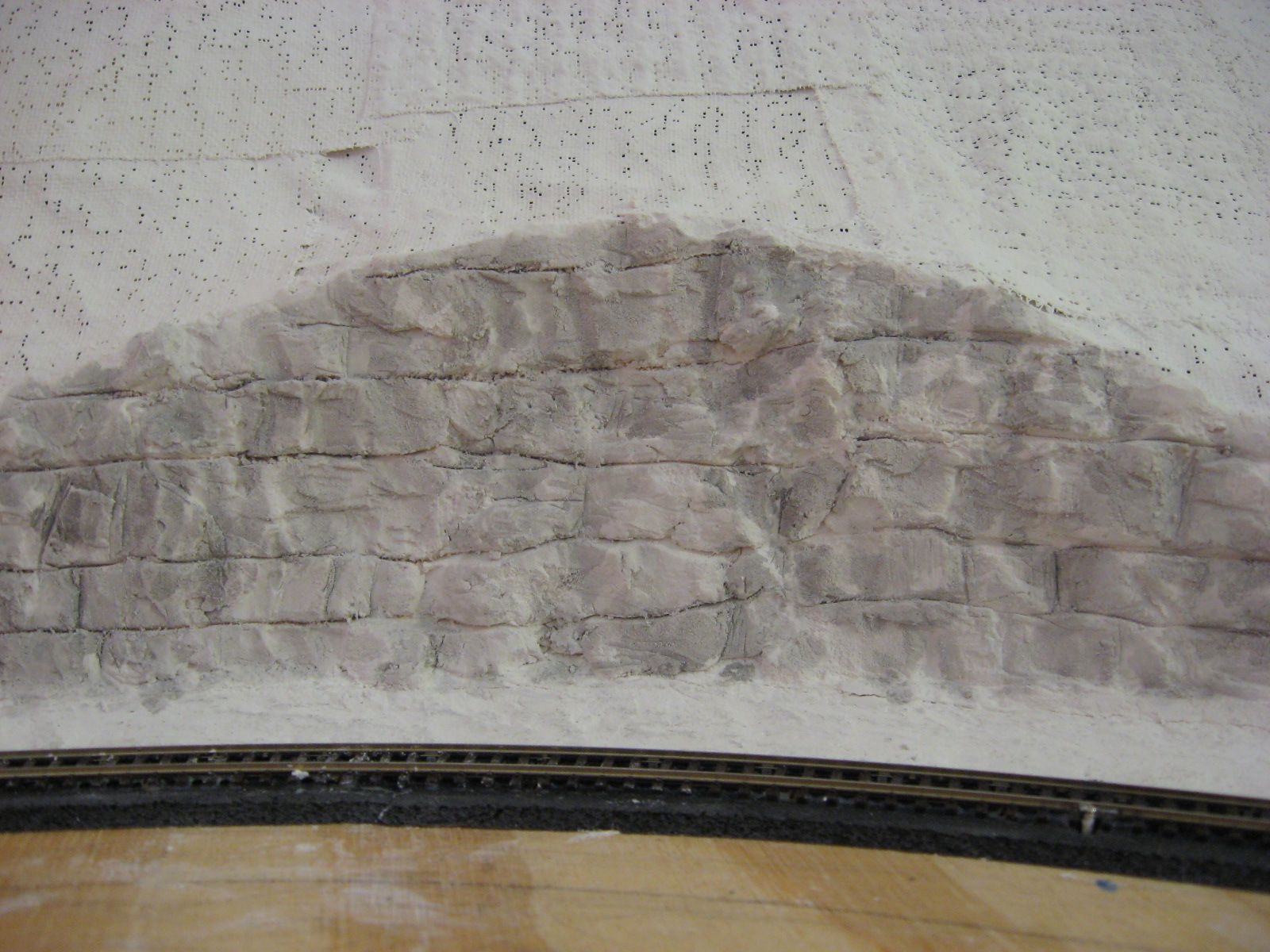 After the black wash dried, I created a brown oxide colored wash without the dish soap. I applied this to the wall in the same manor. I will need to create a matching rock wall that will sit on the opposite side of the track at a later date. I will also add random rocks around the ridge.