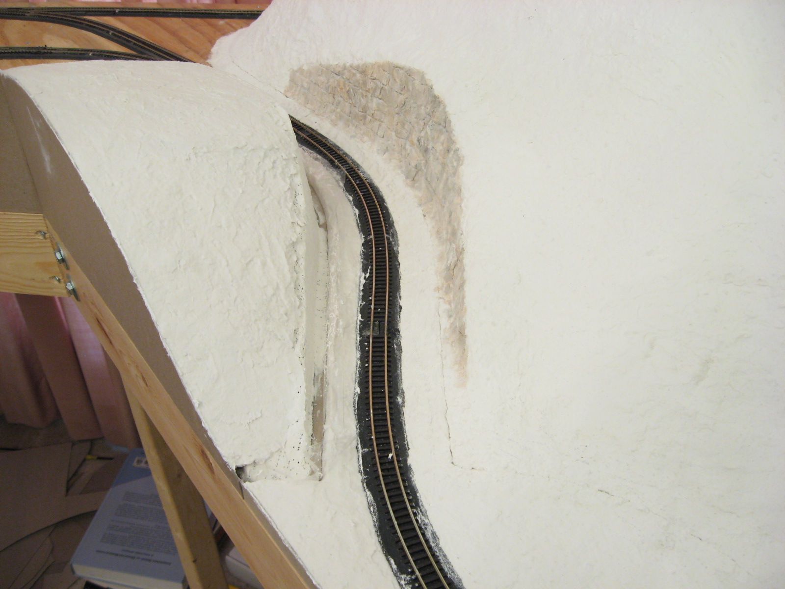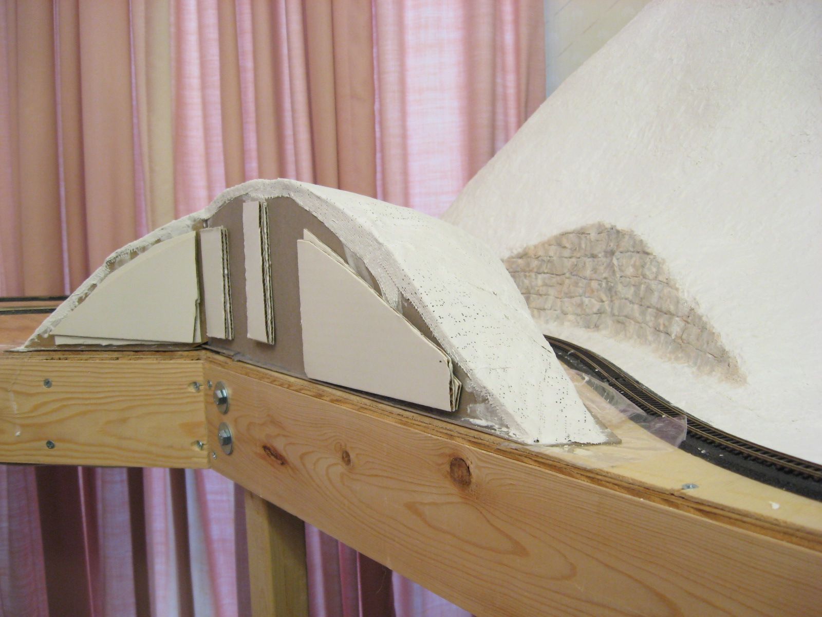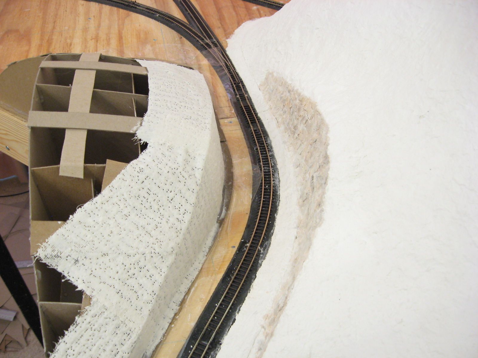 I applied Sculptamold on the plywood surface surrounding the ridge and the ridge�s surface. I lifted the plastic wrap out of the way when I placed the Sculptamold between the ridge and the track. After that dried for a few days, I laid the plastic wrap back down over Sculptamold and track. I applied Sculptamold in the gap between the ridge and the protected layer of Sculptamold. I let it dry a few days before I filed the surfaces to create the seam.