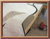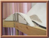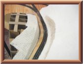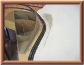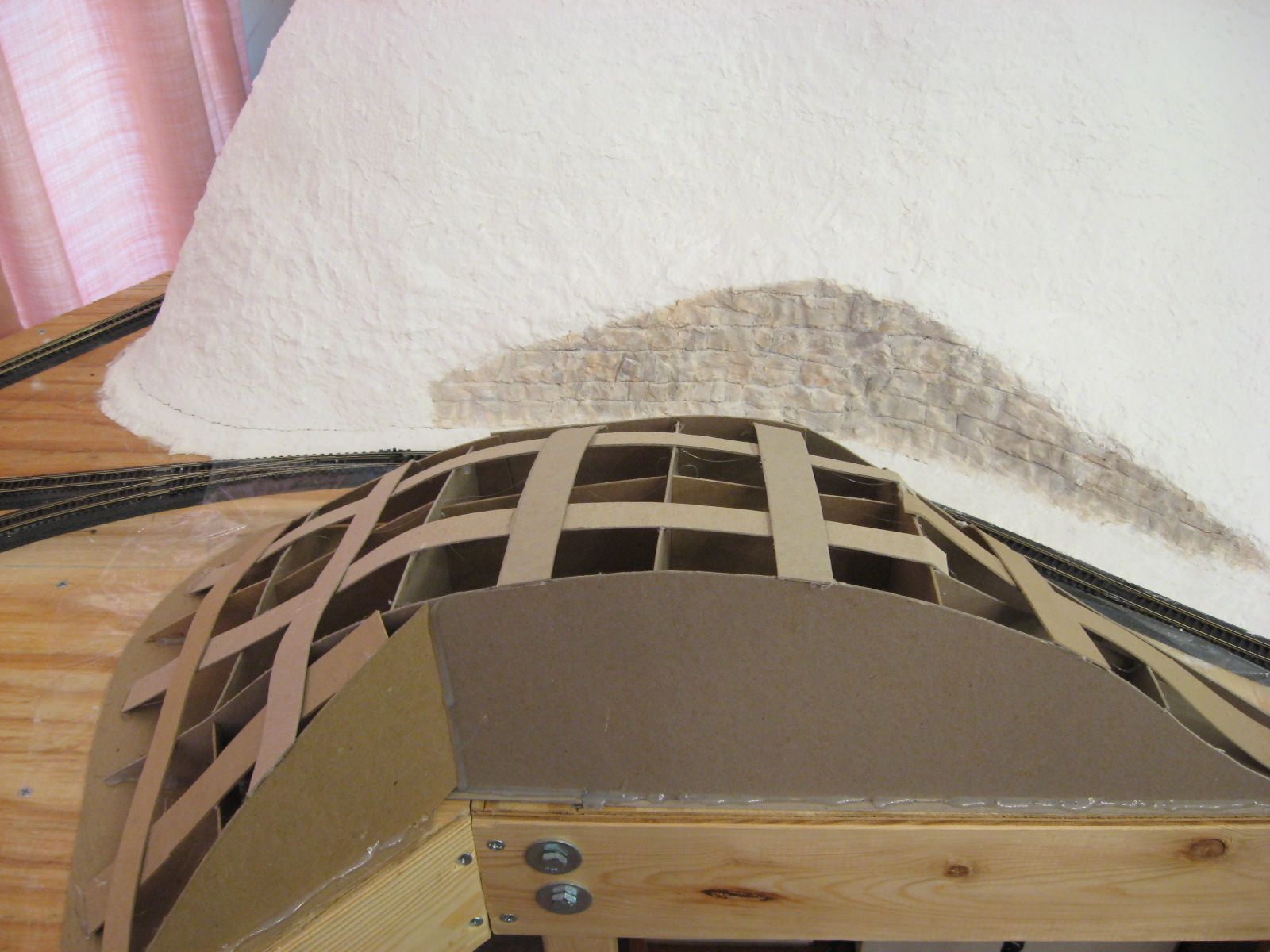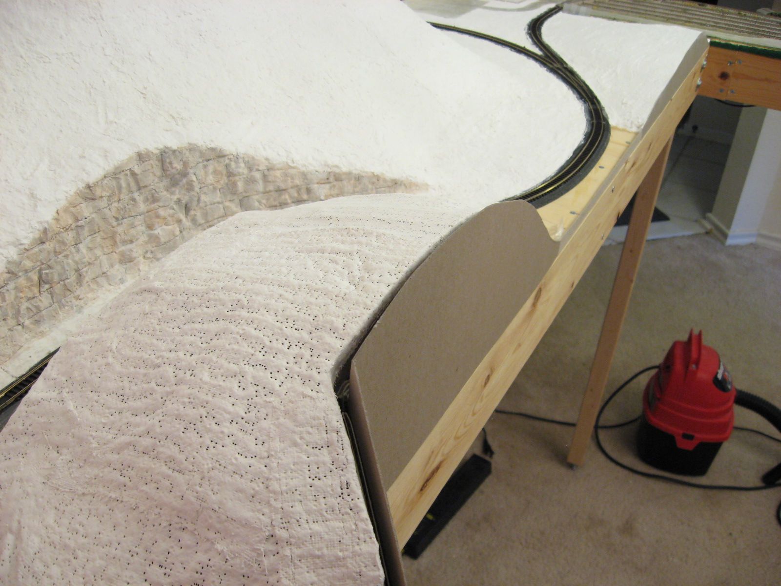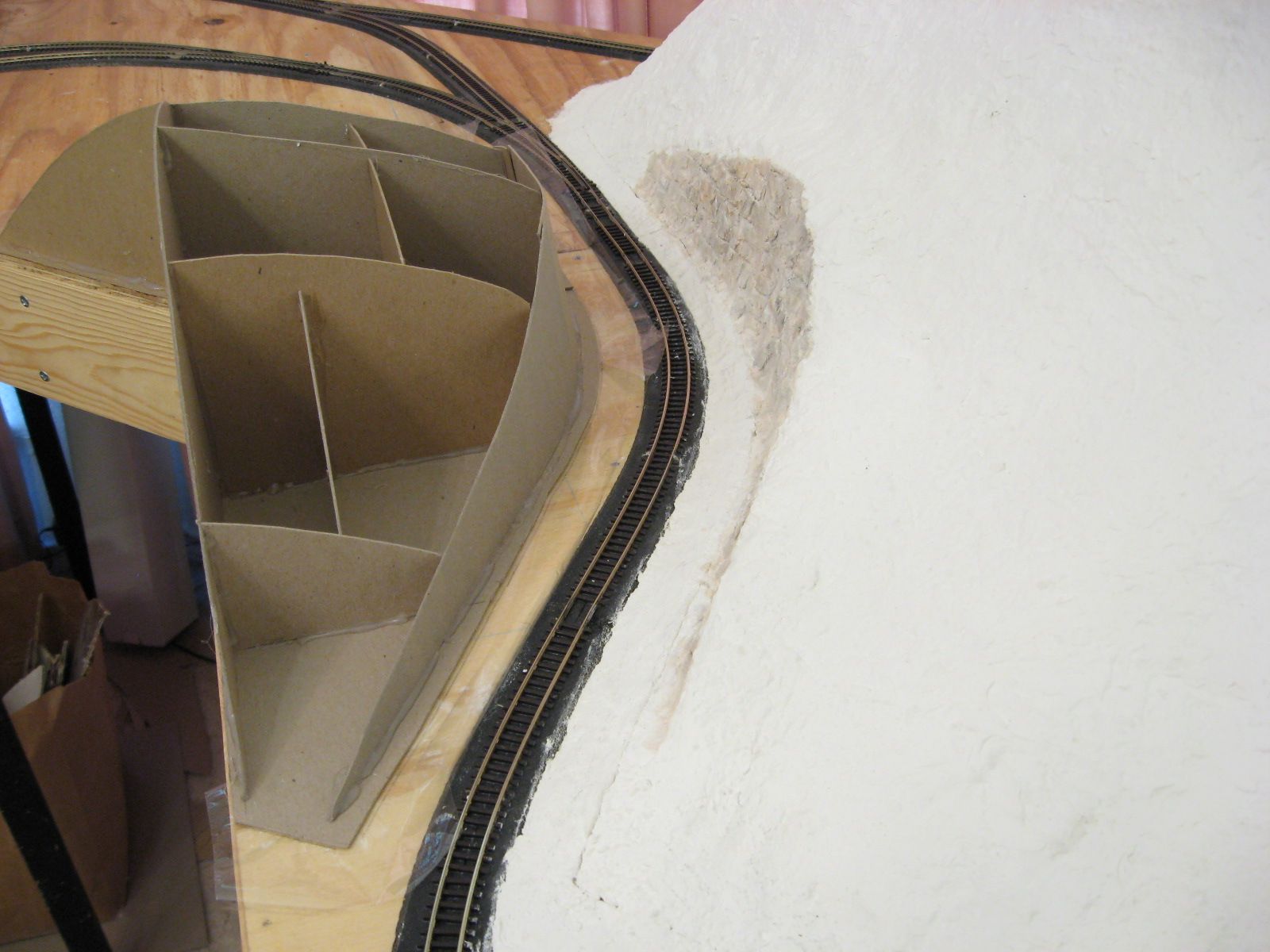 I applied Sculptamold on the plywood surface surrounding the ridge and the ridge�s surface. I lifted the plastic wrap out of the way when I placed the Sculptamold between the ridge and the track. After that dried for a few days, I laid the plastic wrap back down over Sculptamold and track. I applied Sculptamold in the gap between the ridge and the protected layer of Sculptamold. I let it dry a few days before I filed the surfaces to create the seam.