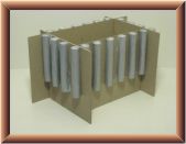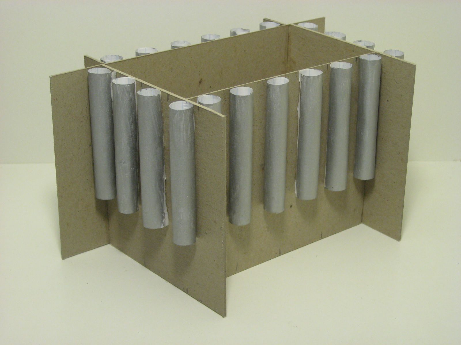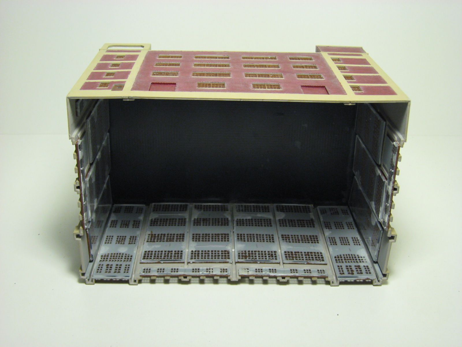 Since this building had large windows, it was easy to see through the building. I had to build a view block to prevent this. I also wanted to add some interior detail. I created the basic structure out of scrap cardboard. This slides into the building from underneath. I made tanks by first rolling scrap paper around a hobby knife handle to form a cylinder. I painted the cylinders with silver paint. I glued them to the cardboard at regular intervals. I did not worry about creating individual floor levels since they could not be seen through the windows. Some of the tanks are visible in the next photo.