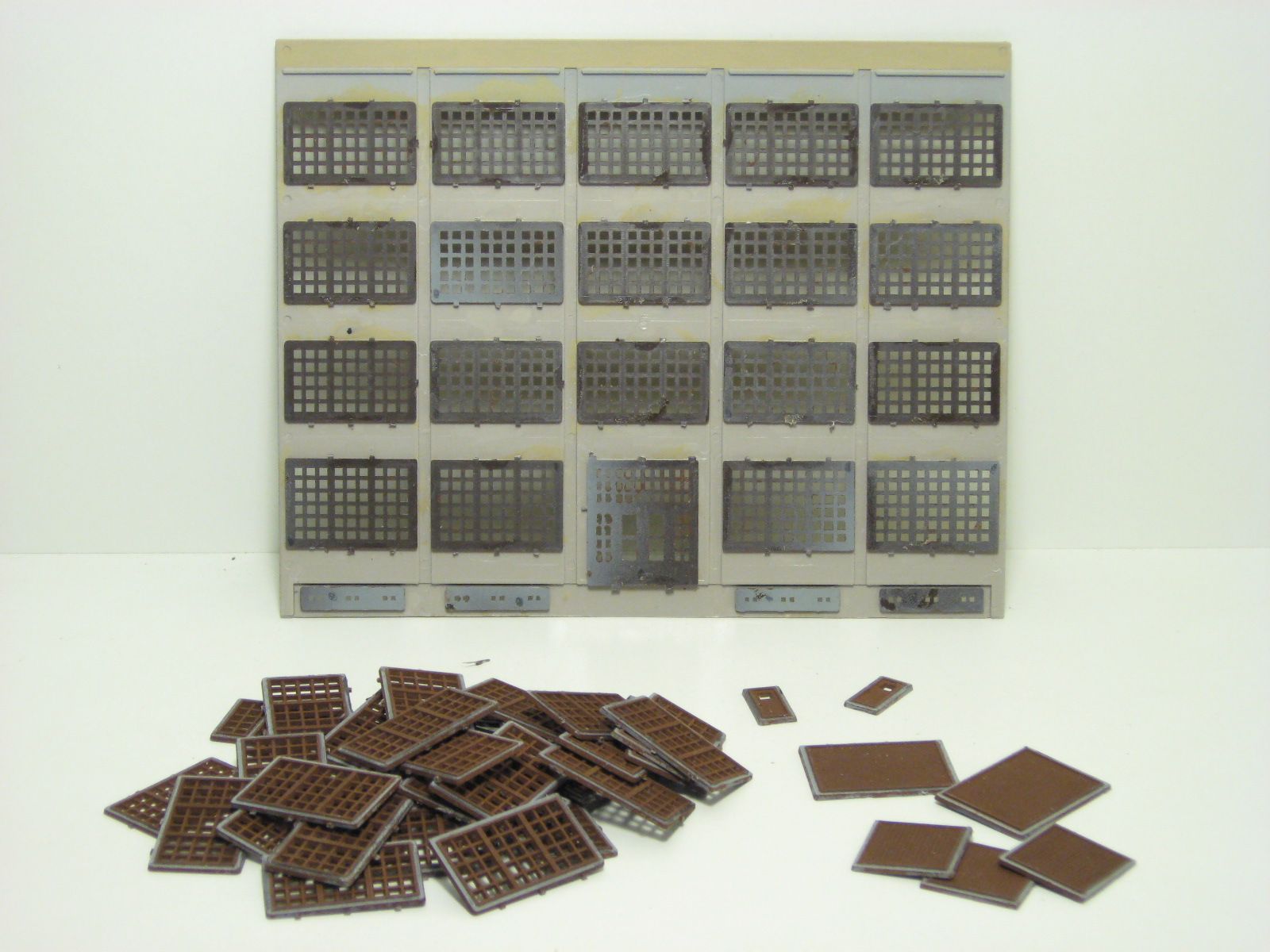 I painted all of the window frames and doors brown. It took quite a while to get all of the window frame surfaces covered. After the paint dried, I used a hobby knife to remove the paint along the edges to provide a clean gluing surface. I glued them to the walls.