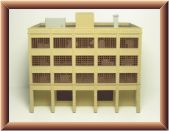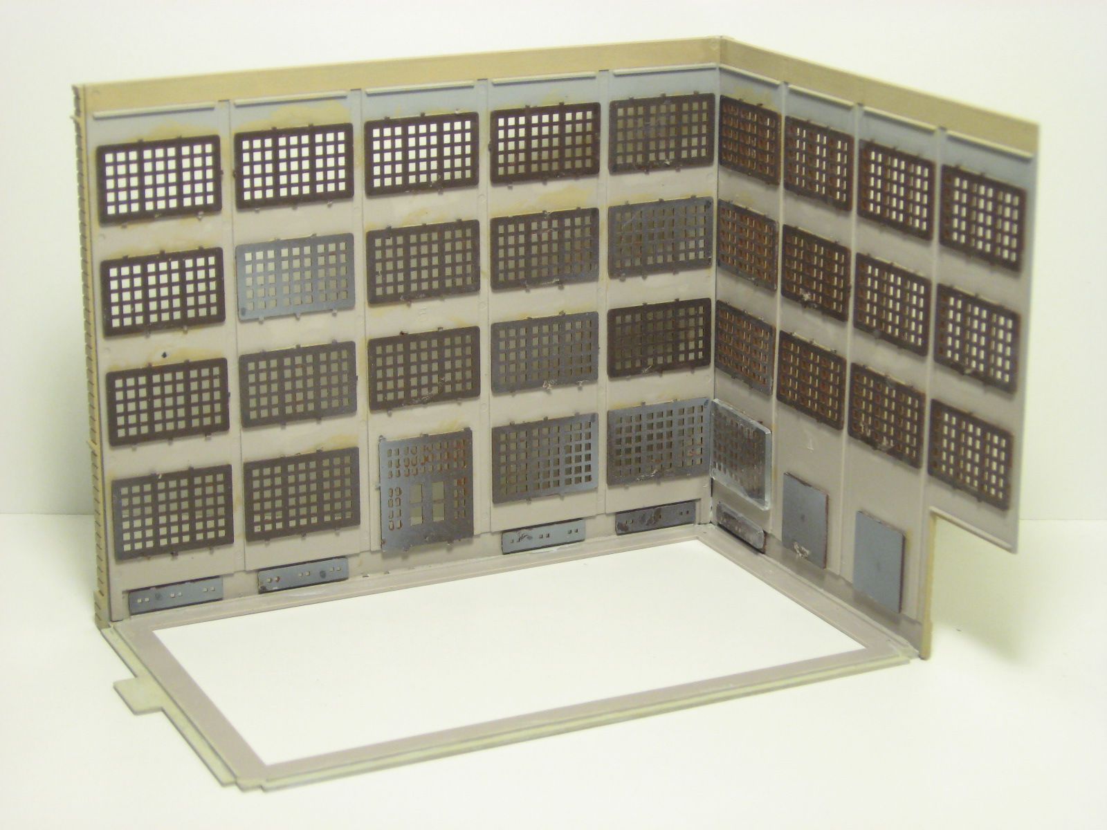 Next, I glued the walls together. I had to use the base piece this time due to the railroad dock area and a few warped walls. I glued the clear plastic over the back of the window frames.