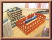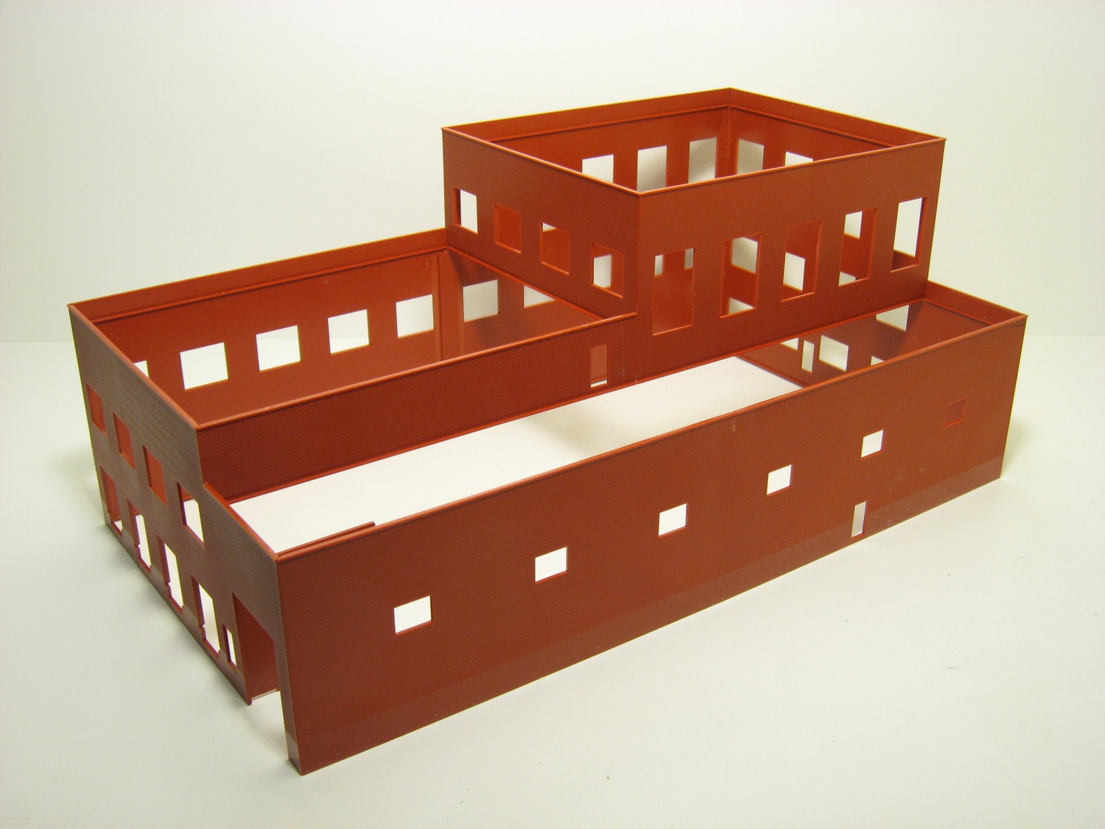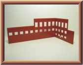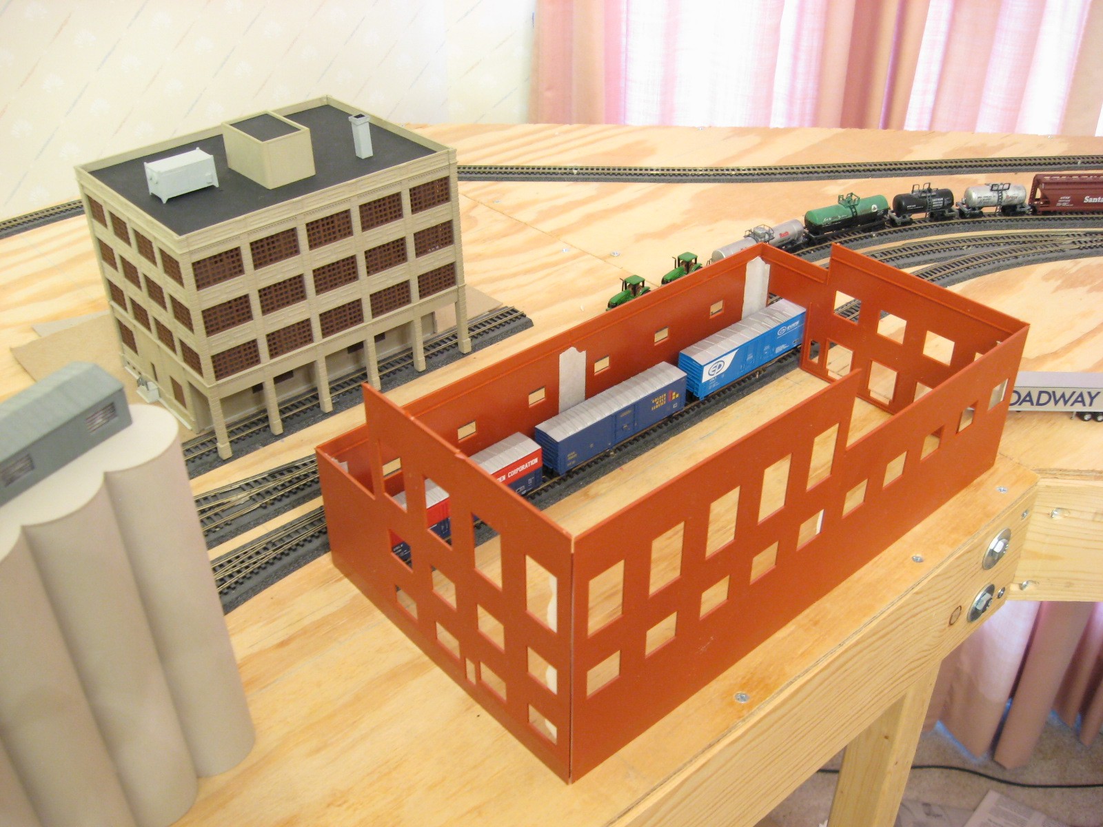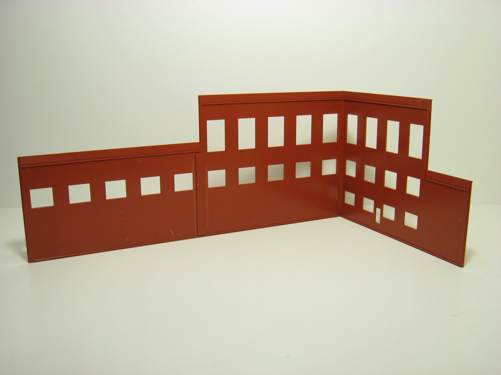 I started thinking the structure was not going to be big enough for the warehouse. I searched around for another kit that I could add to this structure to enlarge it, but did not find any that matched the design. I decided to temporarily put the walls together to see how it would look on the layout. I used masking tape to attach the walls together. After seeing it amongst the other buildings, I decided it would work. I did notice that there was not enough space for trucks to maneuver to back up to the dock doors. I will solve this by scratch building a covered dock that will allow the trucks to back up at a forty five degree angle to the back of the building.