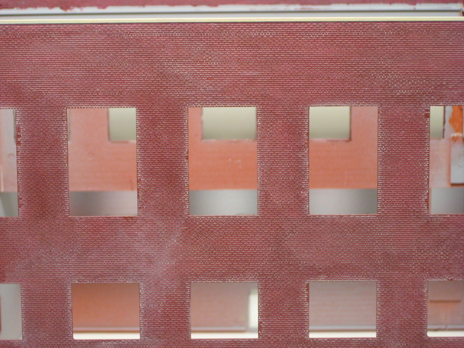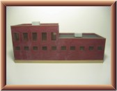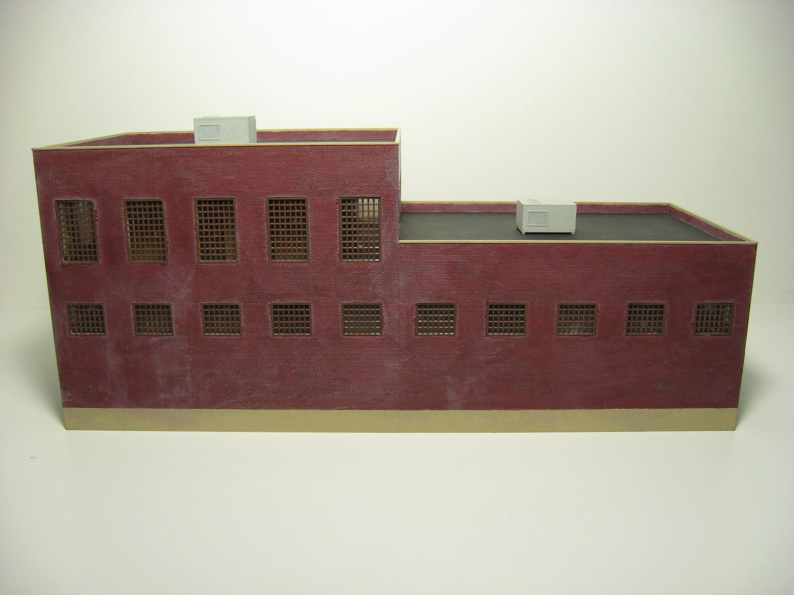 I prayed gray primer on the structure. I then painted the trim the same tan color I used on previous buildings. I painted the brick surfaces with the same burgundy color I used before. I applied a gray wash to the bricks to simulate the mortar and a weathered appearance.