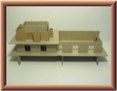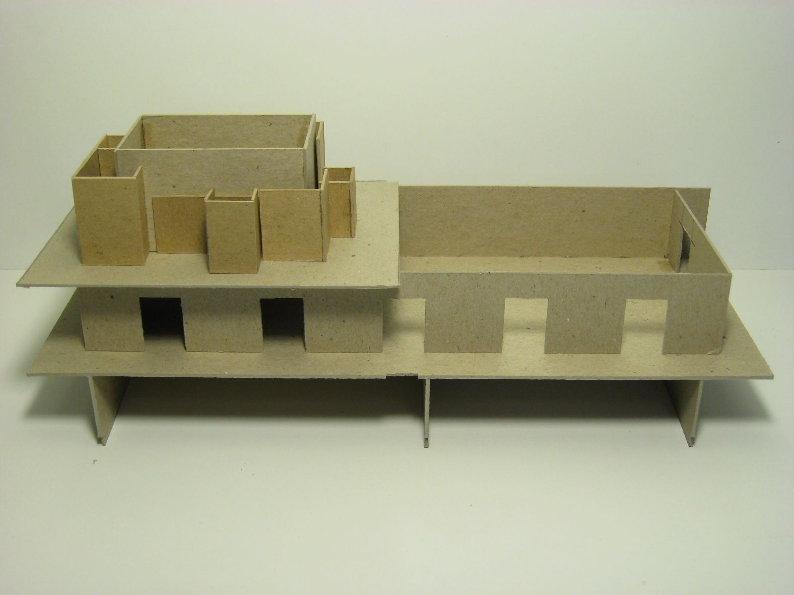 Since this building had large windows, I decided to create an interior insert to add detail and block the direct view through the building. On the bottom level I only needed to block the view just past the windows on the front of the building. On the second floor I added walls with large openings to depict storage bays. On the third floor I added cardboard colored structures to represent stacked product.