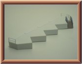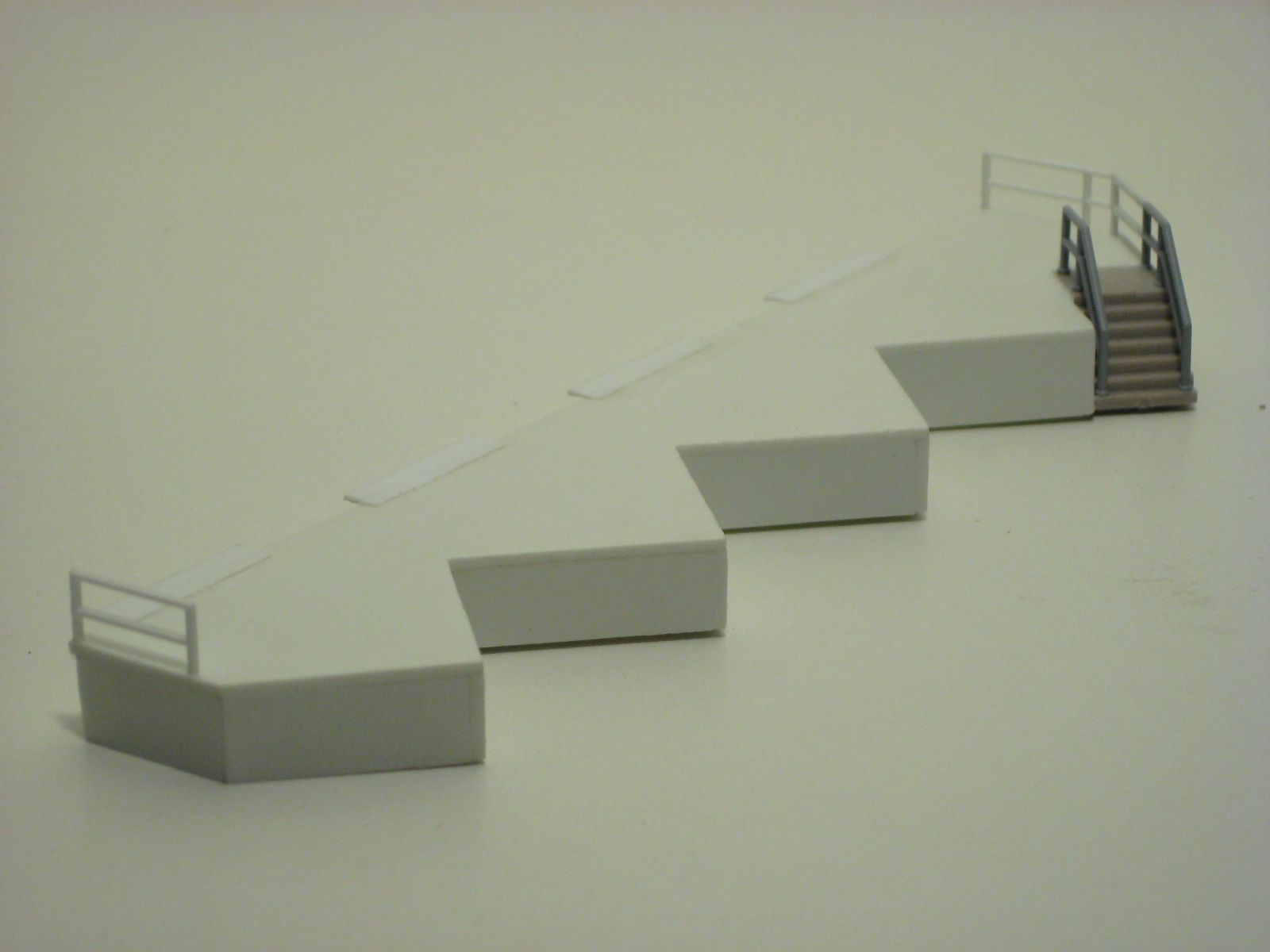 I cut some styrene strips and glued them perpendicular along the perimeter. I attached four thin tapered styrene pieces to the back of the dock. These will cover the voids below the dock doors where bumpers were to be attached. Next, I glued the stairwell in place. I decided to use the stair rails from the kit too. I glued them in place and added some additional rails to each side of the dock. I spray painted the entire dock structure with gray primer. After that dried, I applied a couple concrete colored washes to the dock surfaces. I left the rails the original gray primer color. I painted yellow safety stripes along the dock sections not protected by railing. I used masking tape to mask off the strips I wanted to paint.
