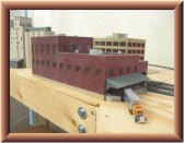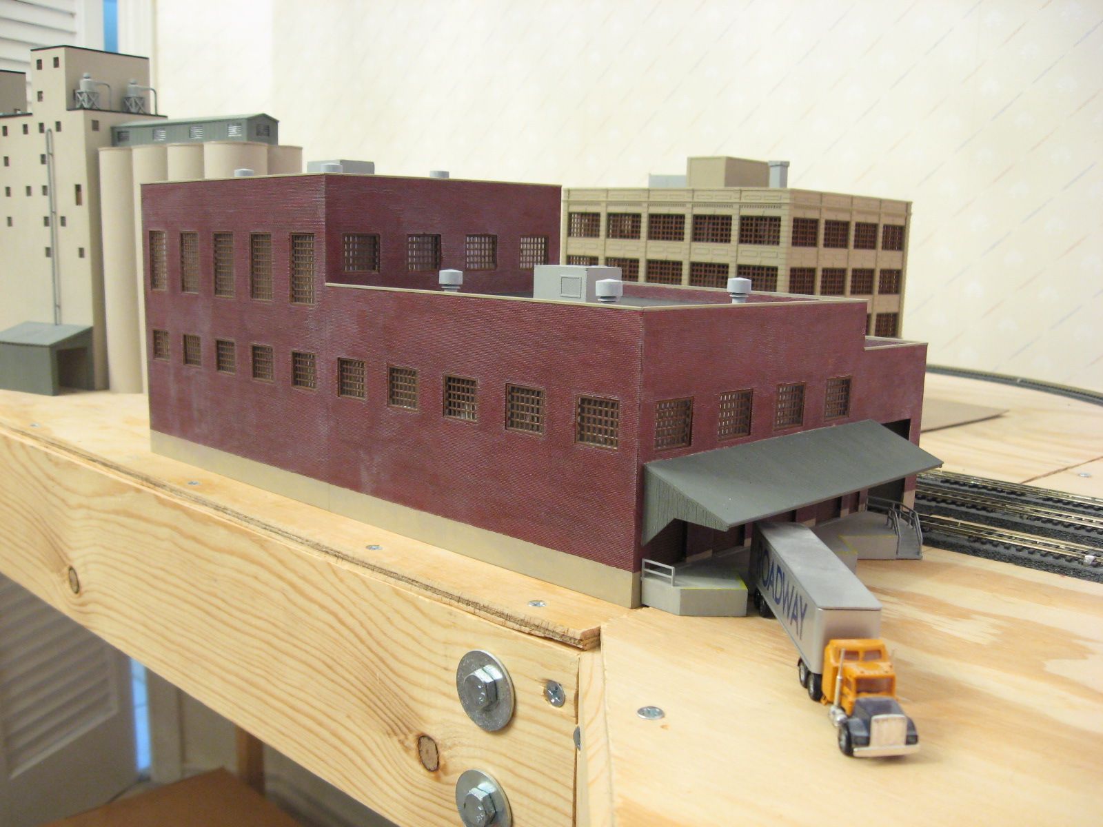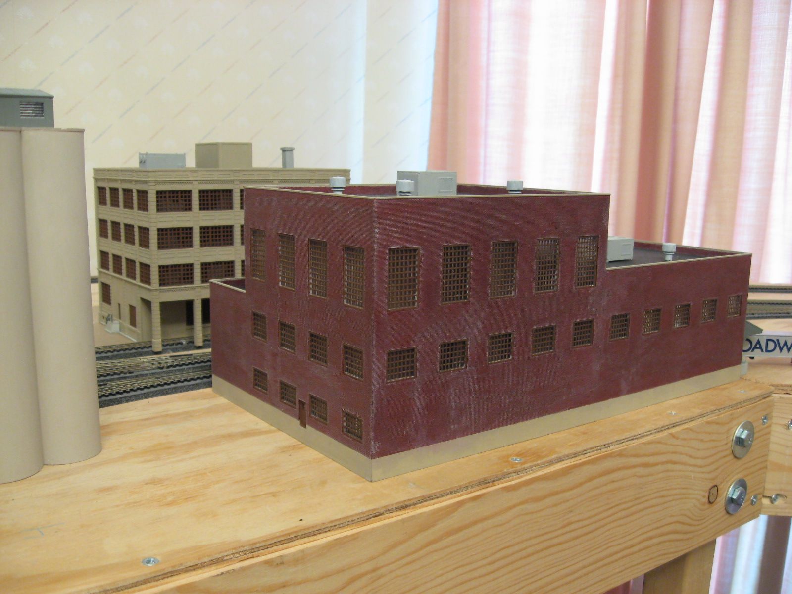 I still need to create a covered conveyor to connect this building the bottling plant. I cannot do this until both buildings are sitting on their permanent foundations. Since the buildings in the brewery complex are together now, it looks like I will be moving back to scenery for a while. I still have an area on the other side of the layout that needs scenery applied. I need to rehab the scenery on the original NTRAK module. I can also start laying out the brewery complex foundations, roads, parking lots, and sidewalks.