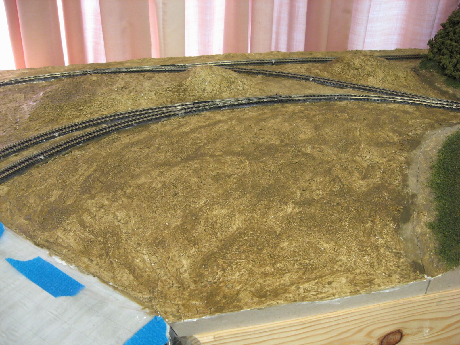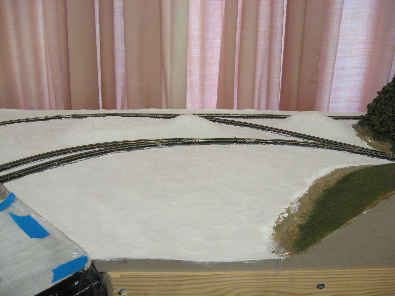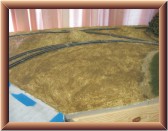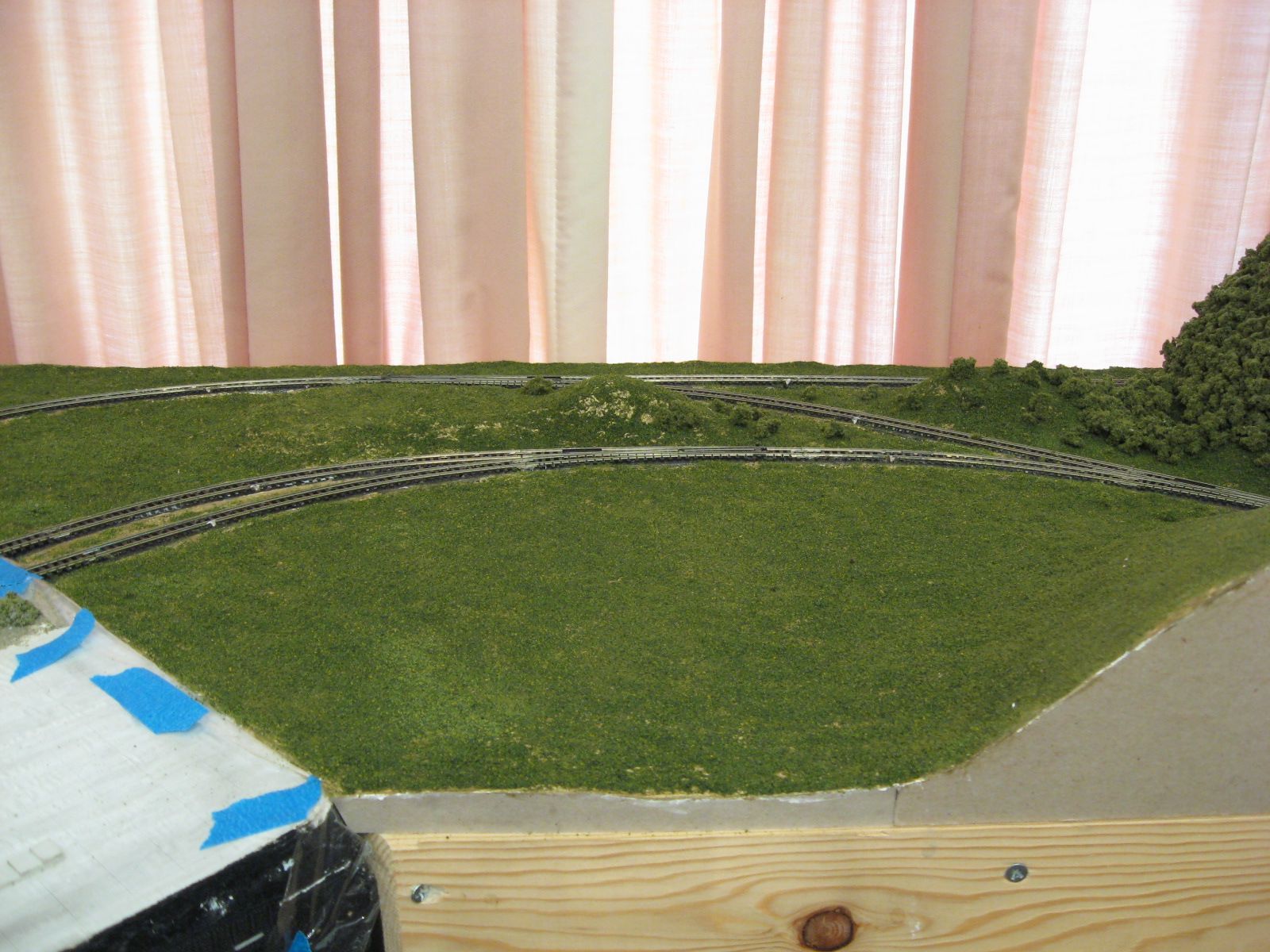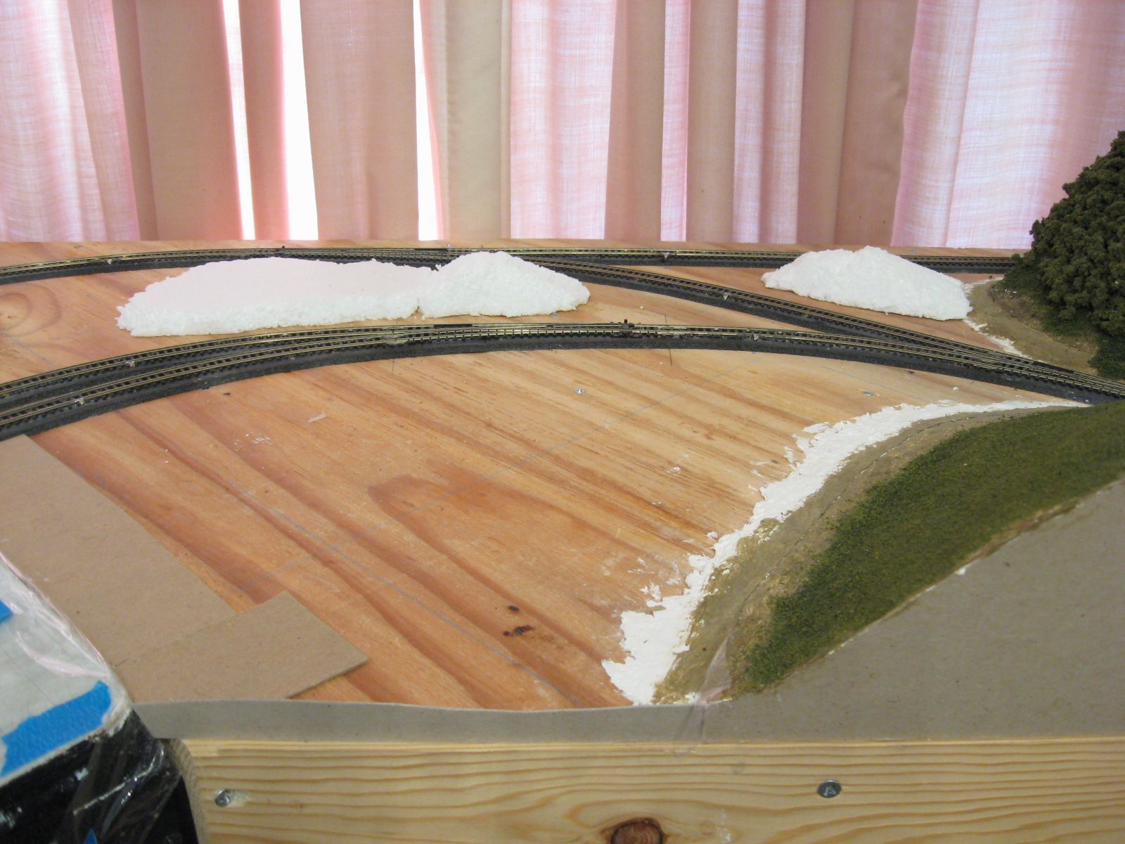 To finish the prep work, I added a piece of cardboad along the front of the module to form a contoured fascia between the small ridge and the edge of the NTRAK module. I then decided I did not want the entire surface flat. I found a few pieces of scrap styrofoam and carved them into small hills. I glued them between the tracks.