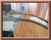 The joint between the NTRAK module and the corner module required some work. First, I placed plastic wrap along the joint to protect the NTRAK module and create a seam. Next, I had to address the large gaps between the two modules. The scenery on the NTRAK module did not come to the edge and the two modules did not fit flush with each other. I glued pieces of cardboard on the corner module surface to bridge gaps between the two modules.