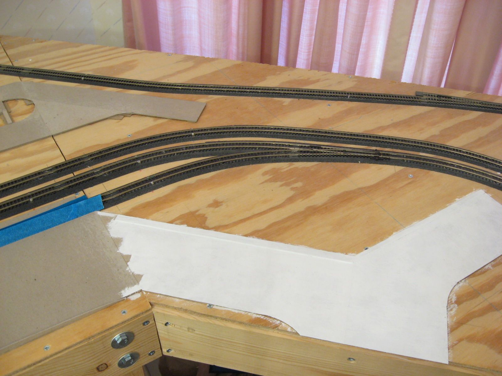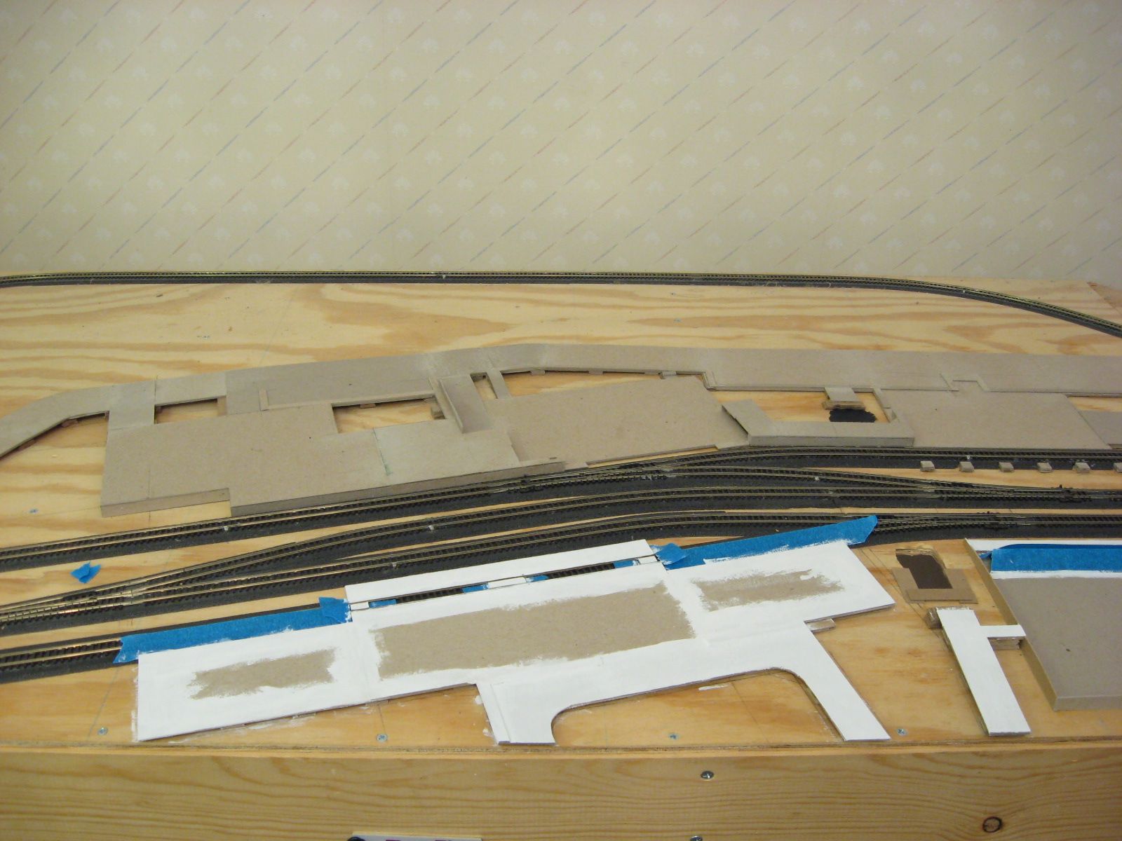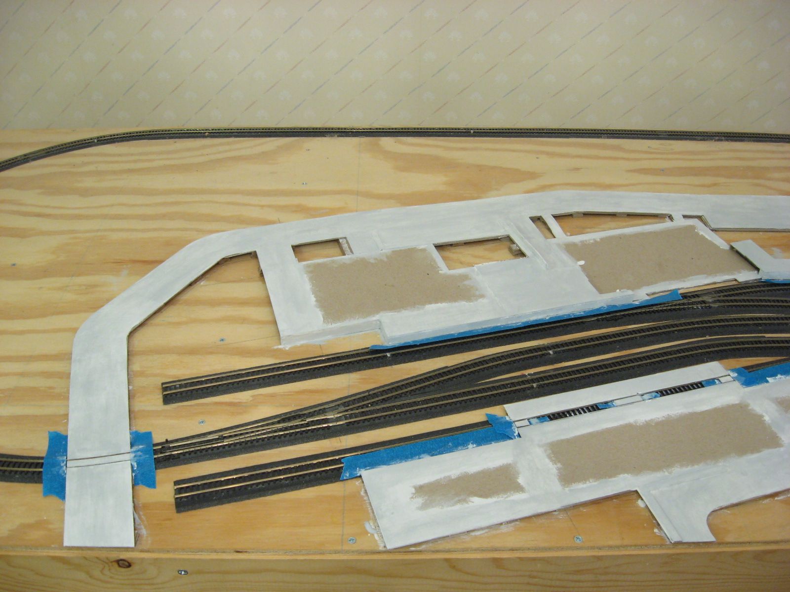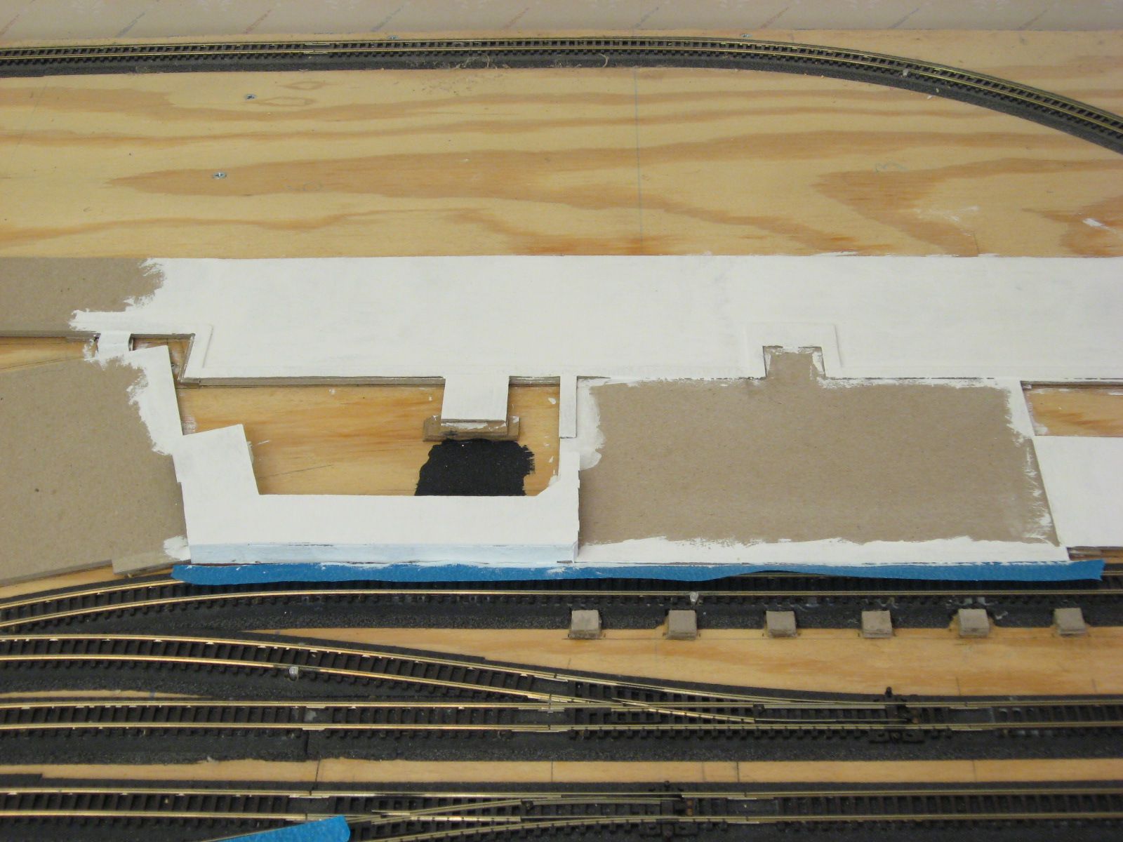 When I originally glued down the cardboard to form the roads and foundations, I also sanded the top surfaces. This did not leave a completely smooth surface. After I painted a surface white, I came back and sanded the rough areas. I painted another coat of white on top.