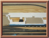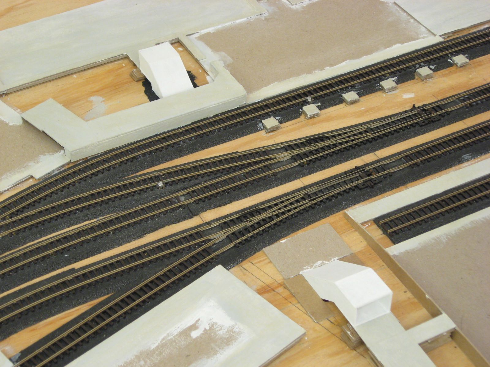 After that dried, I painted the surfaces with a concrete colored wash. I painted the pedestrian walkway tunnel portals with a couple layers of white.