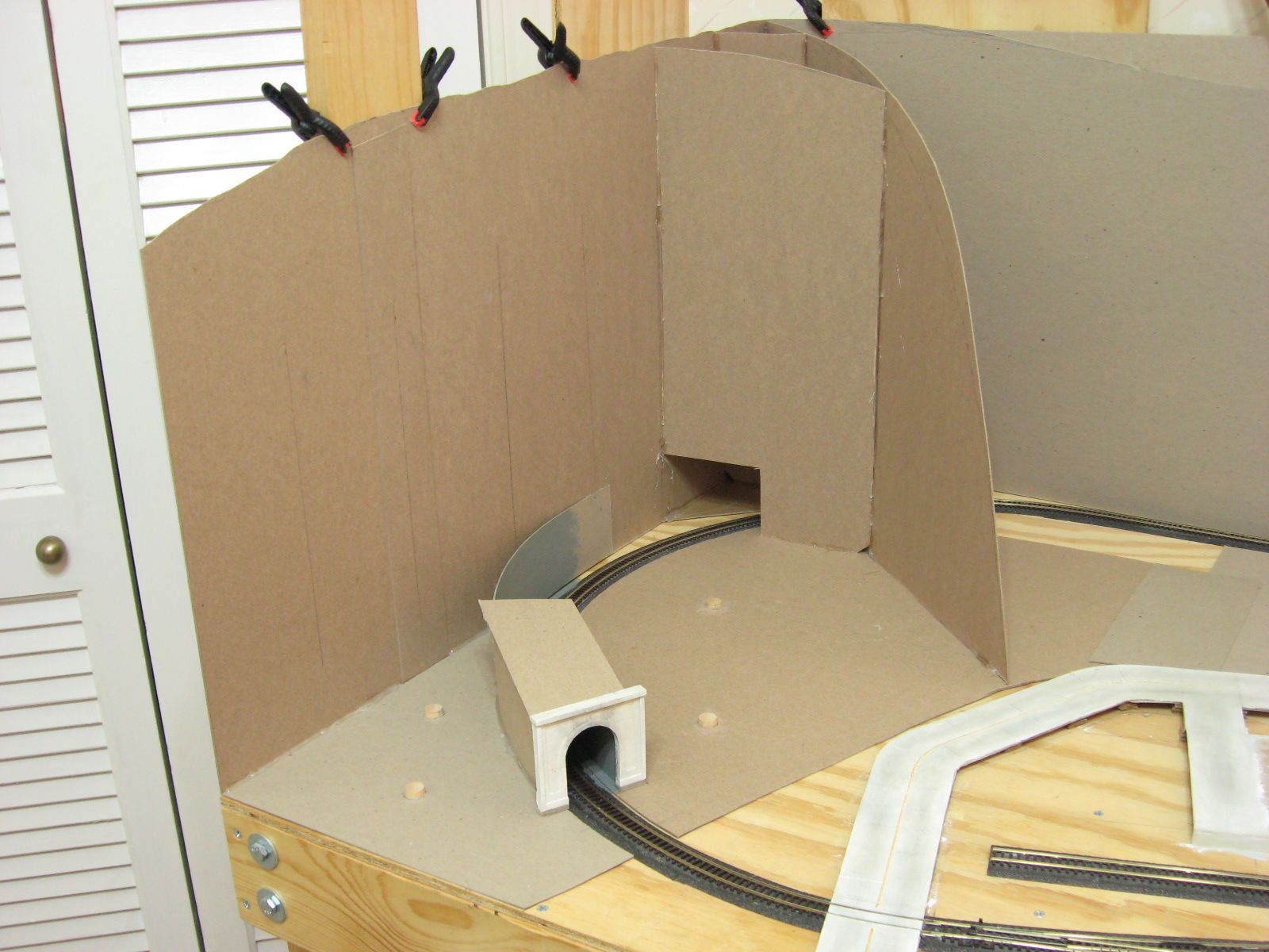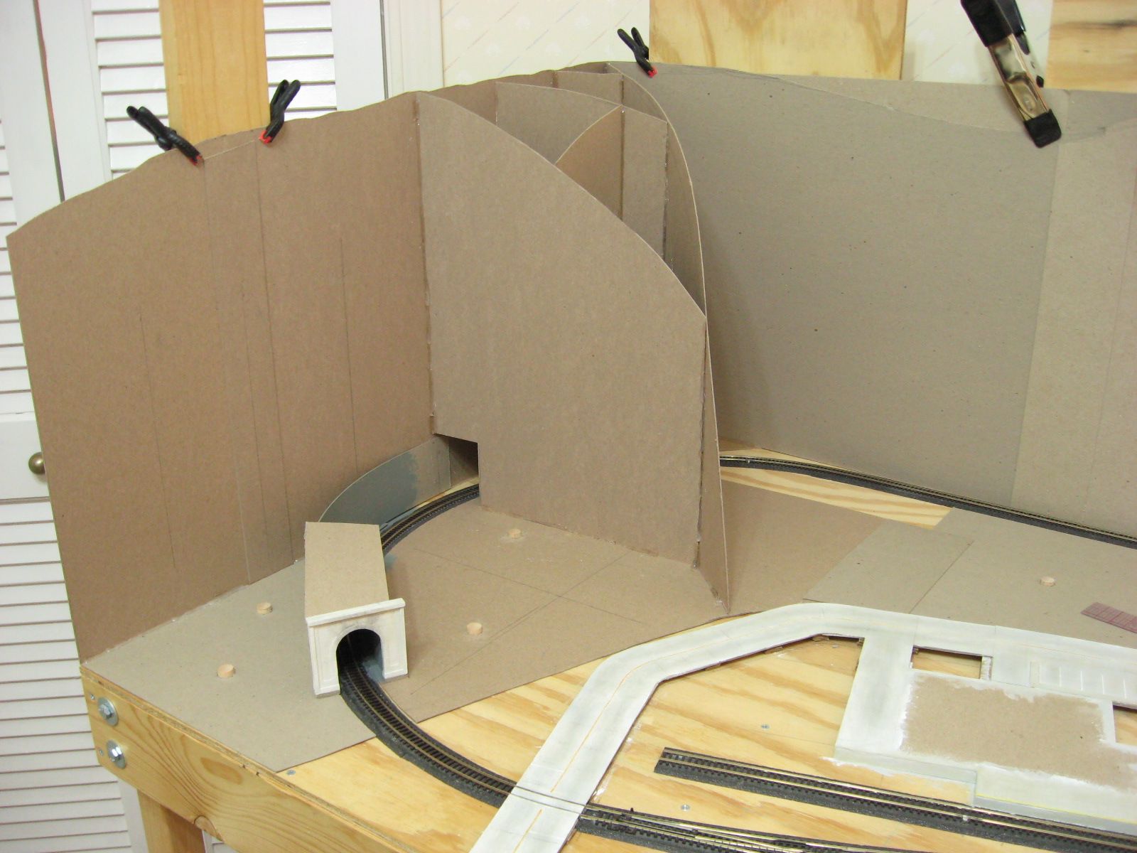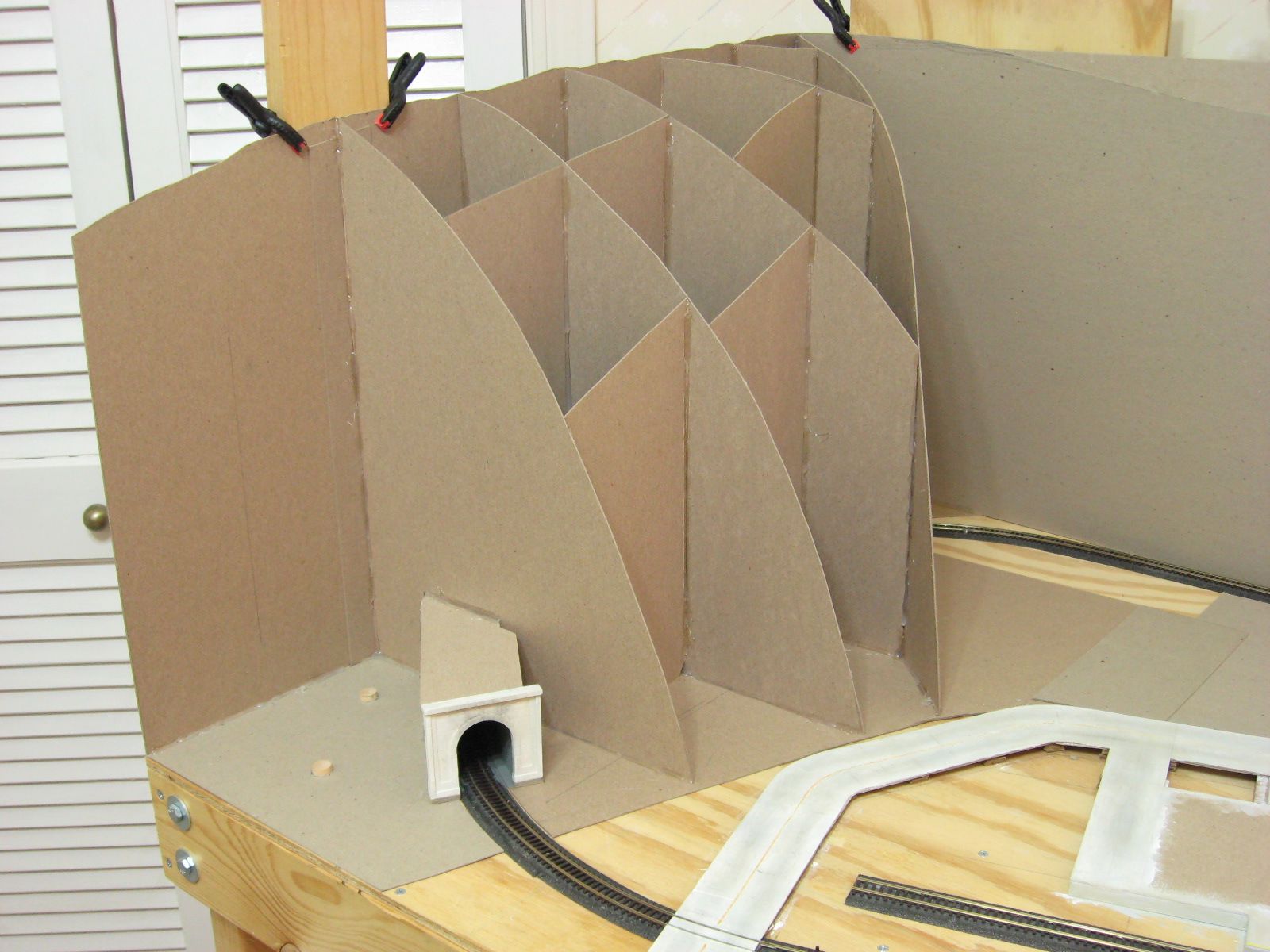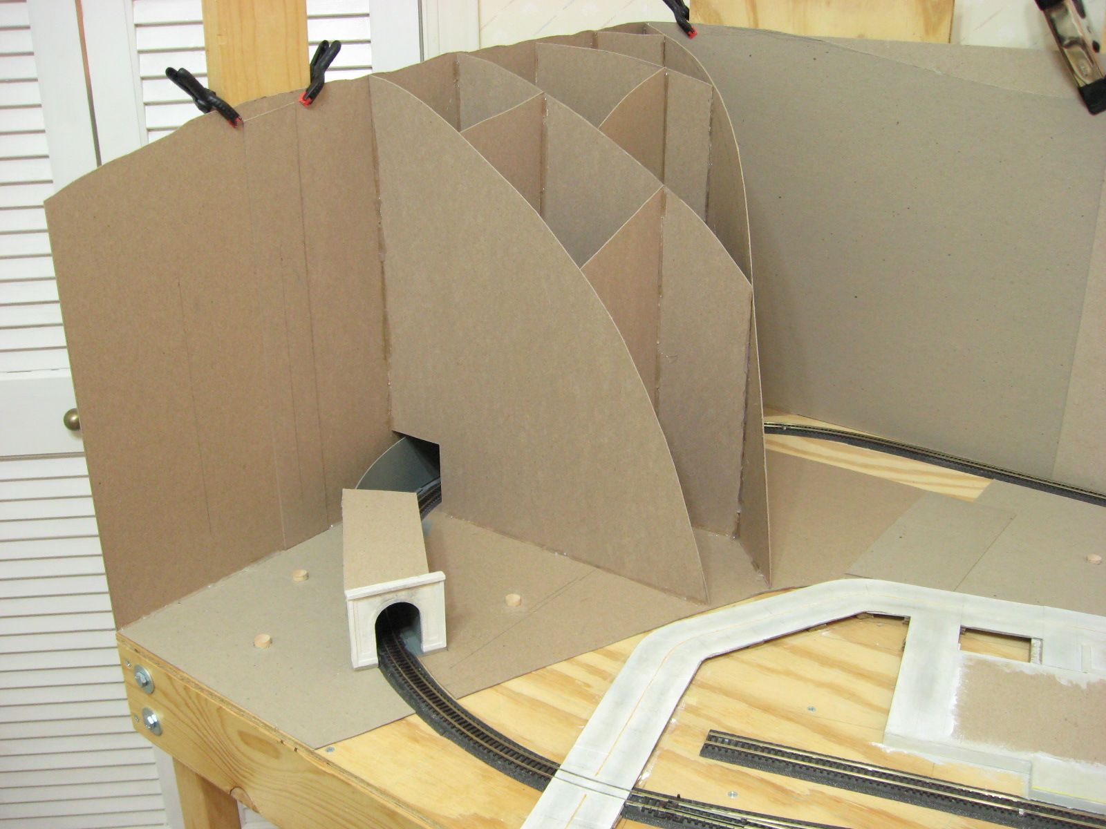 I added vertical triangular cardboard pieces next to the tunnel portal. I will attach custom styrene abutments to these later. I added some other pieces that will provide places to attach horizontal cardboard strips to later.