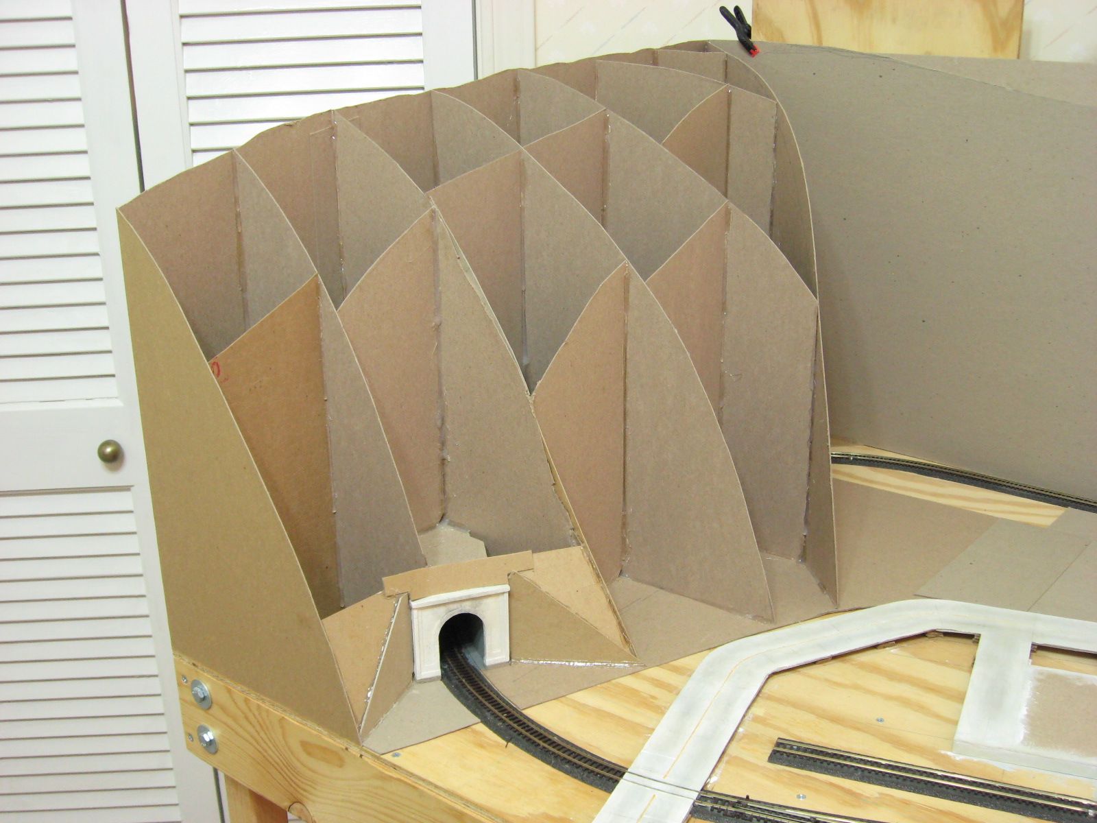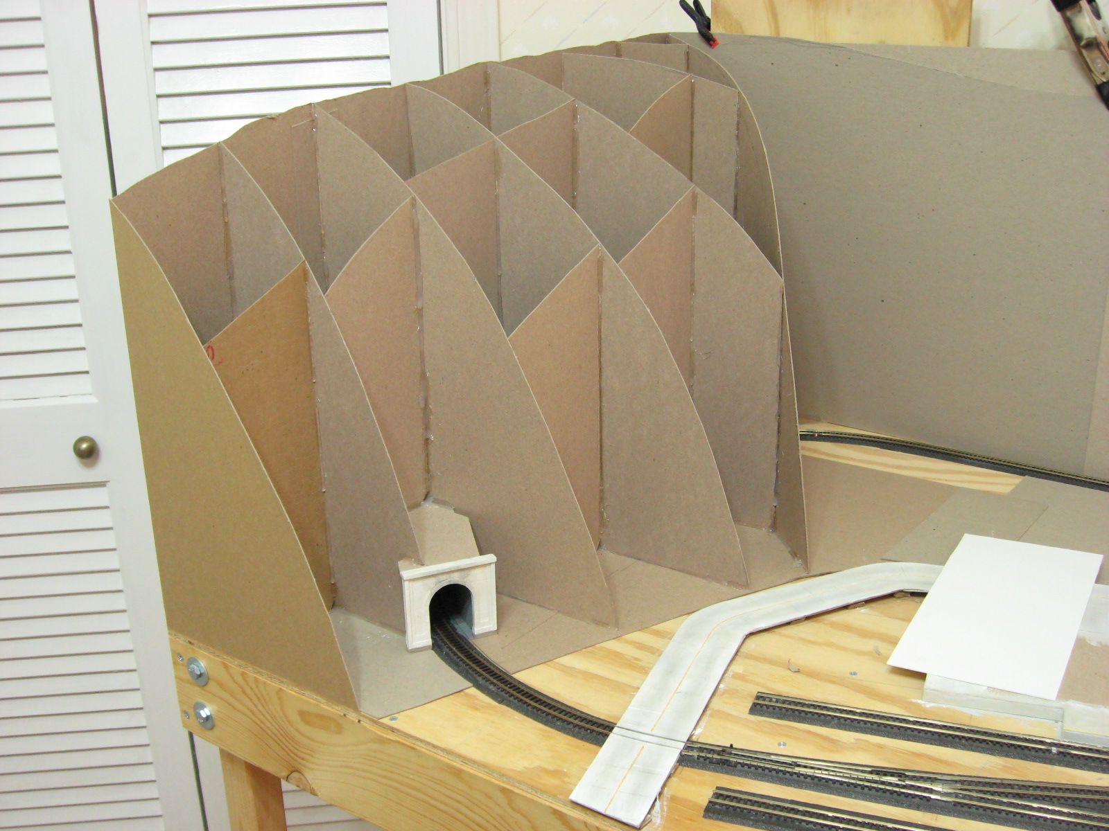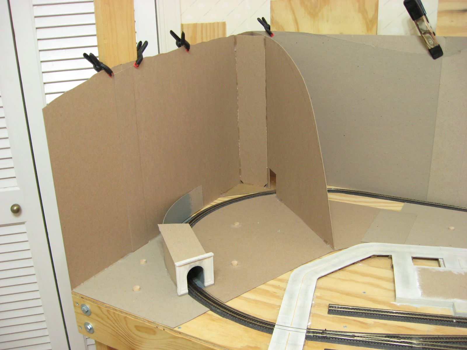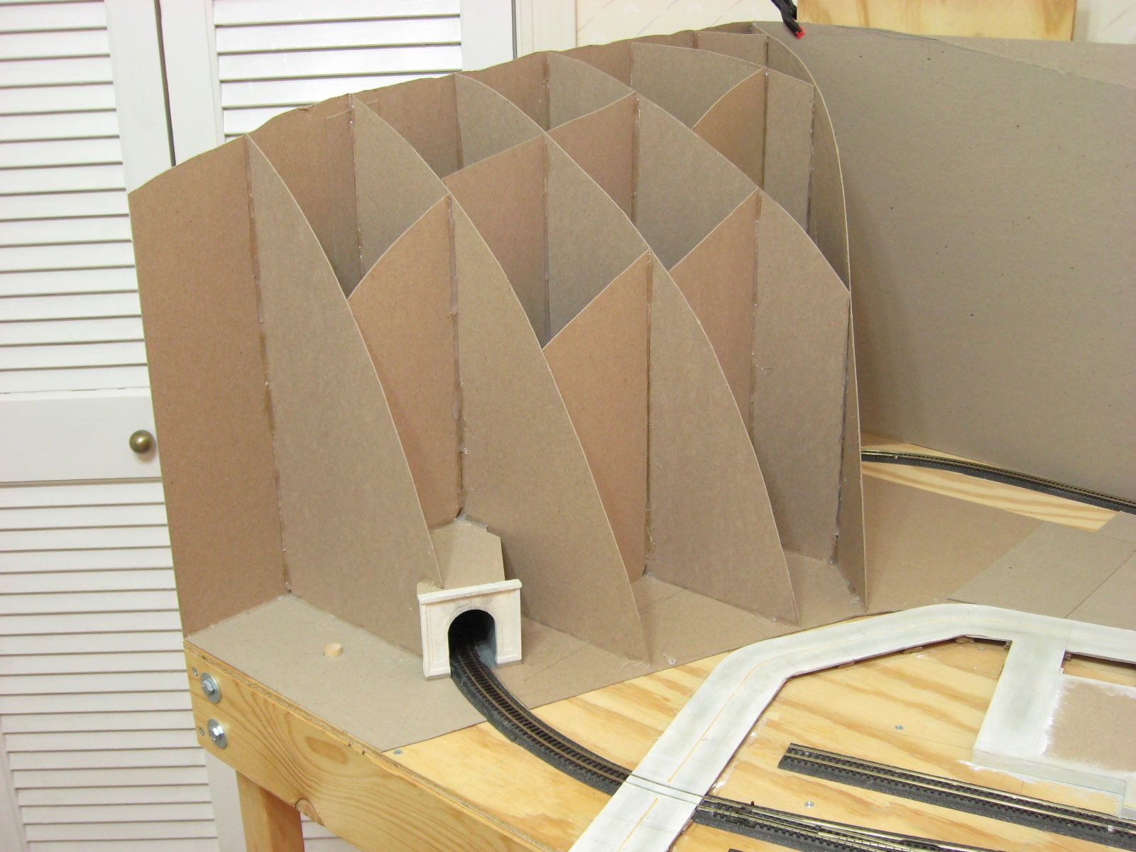 I added vertical triangular cardboard pieces next to the tunnel portal. I will attach custom styrene abutments to these later. I added some other pieces that will provide places to attach horizontal cardboard strips to later.