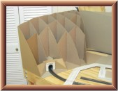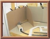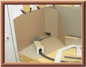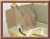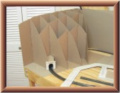 First, I cut out piece of cardboard that would fit between the road and the ridge corner. I cut out a hole for the track opening. I also cut out the shape of the ridge. I hot glued it at forty five degrees off the vertical walls.