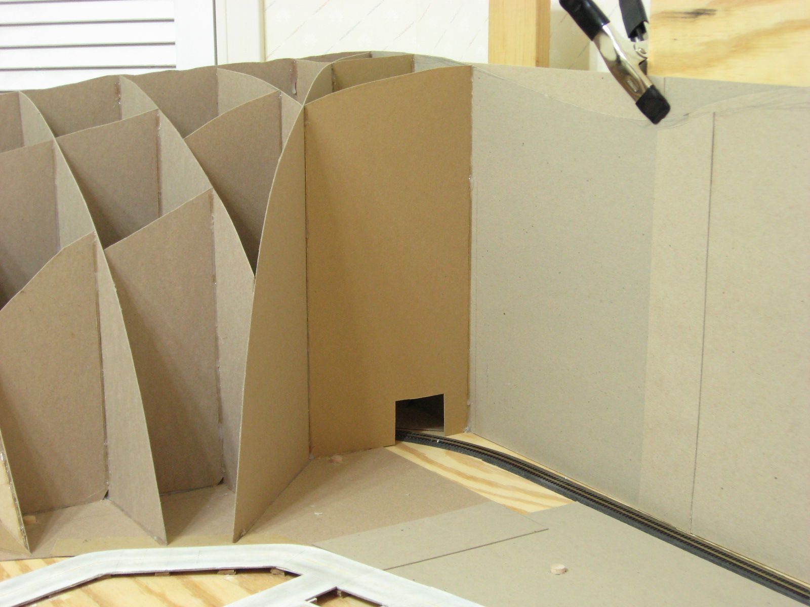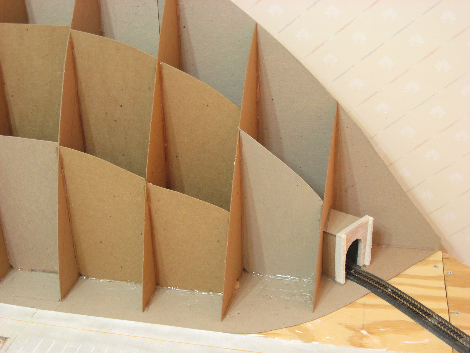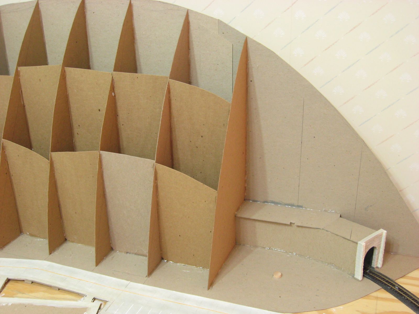 I started work in the same corner as last time. I cut cardboard pieces to fit between the angled wall and back wall. I cut out the ridge shape and holes big enough to fit around the track. I hot glued them in place. I added a few vertical pieces between these walls to add more support.