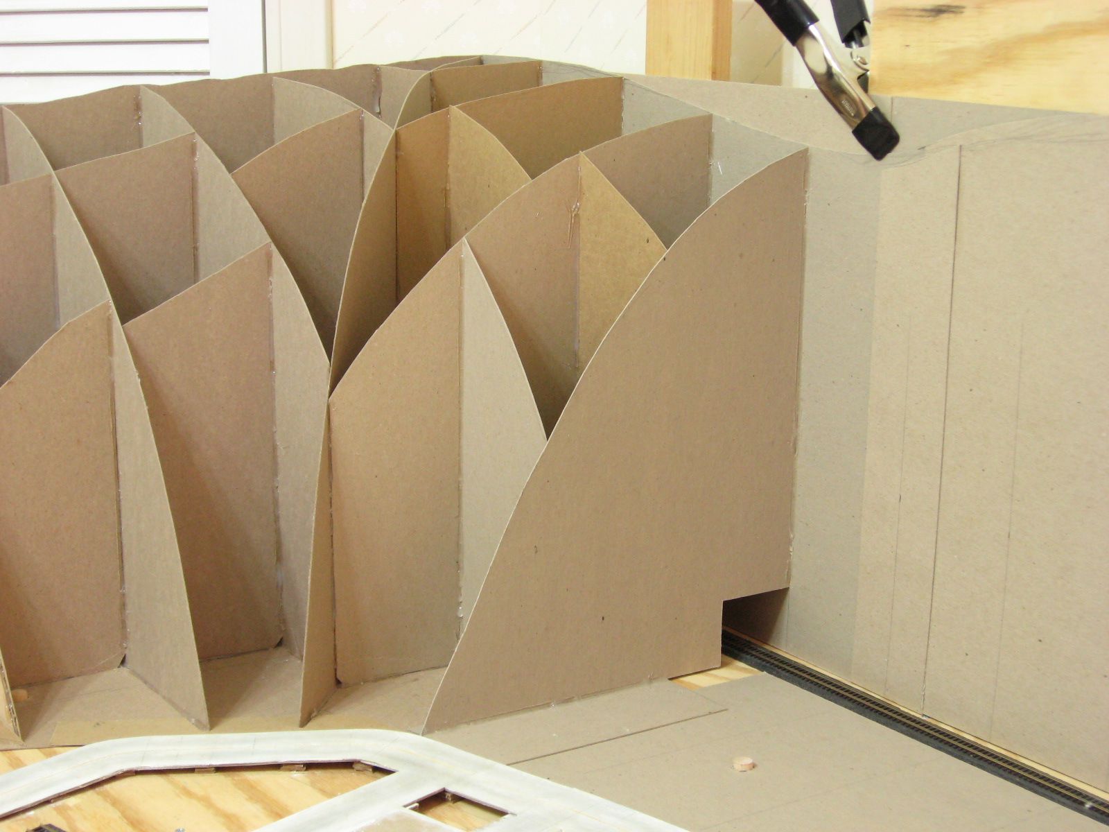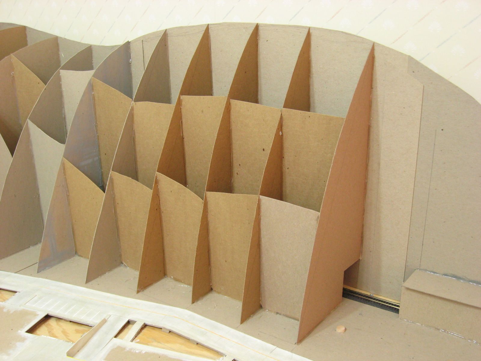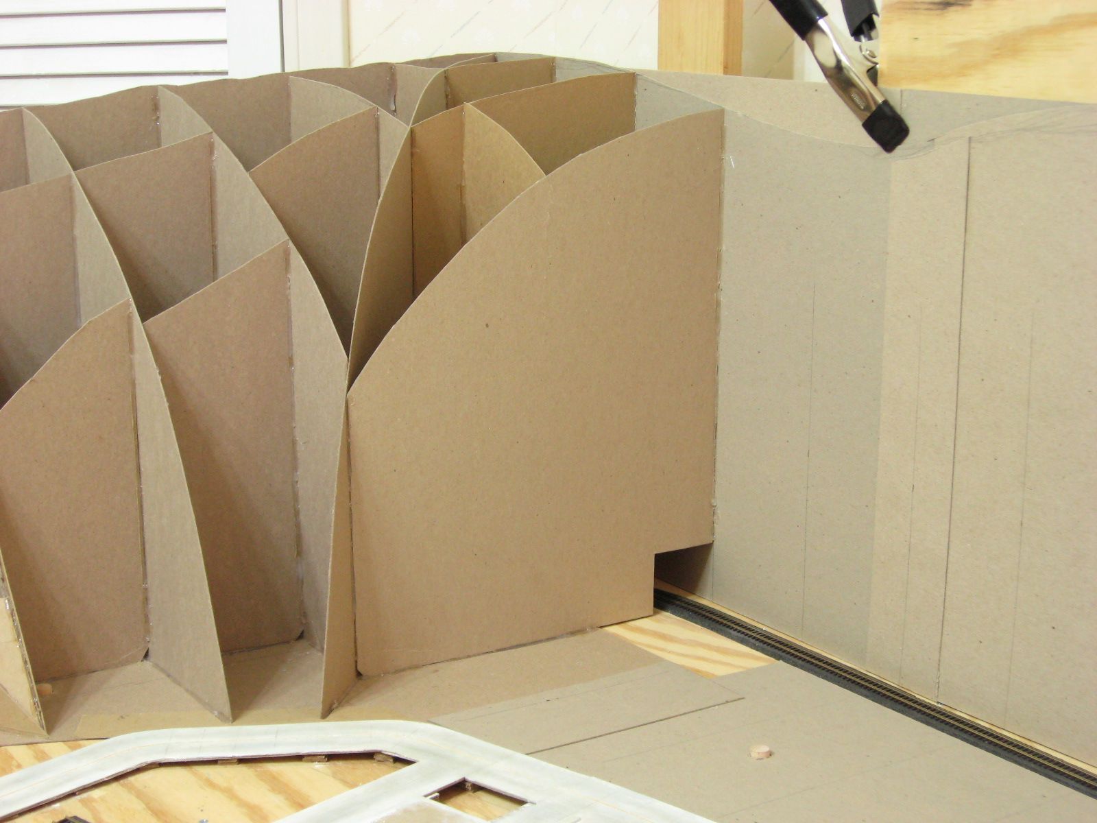 I started work in the same corner as last time. I cut cardboard pieces to fit between the angled wall and back wall. I cut out the ridge shape and holes big enough to fit around the track. I hot glued them in place. I added a few vertical pieces between these walls to add more support.