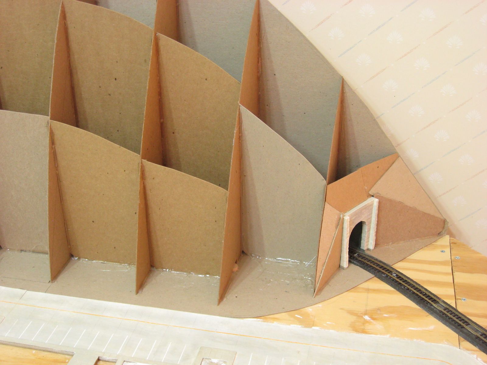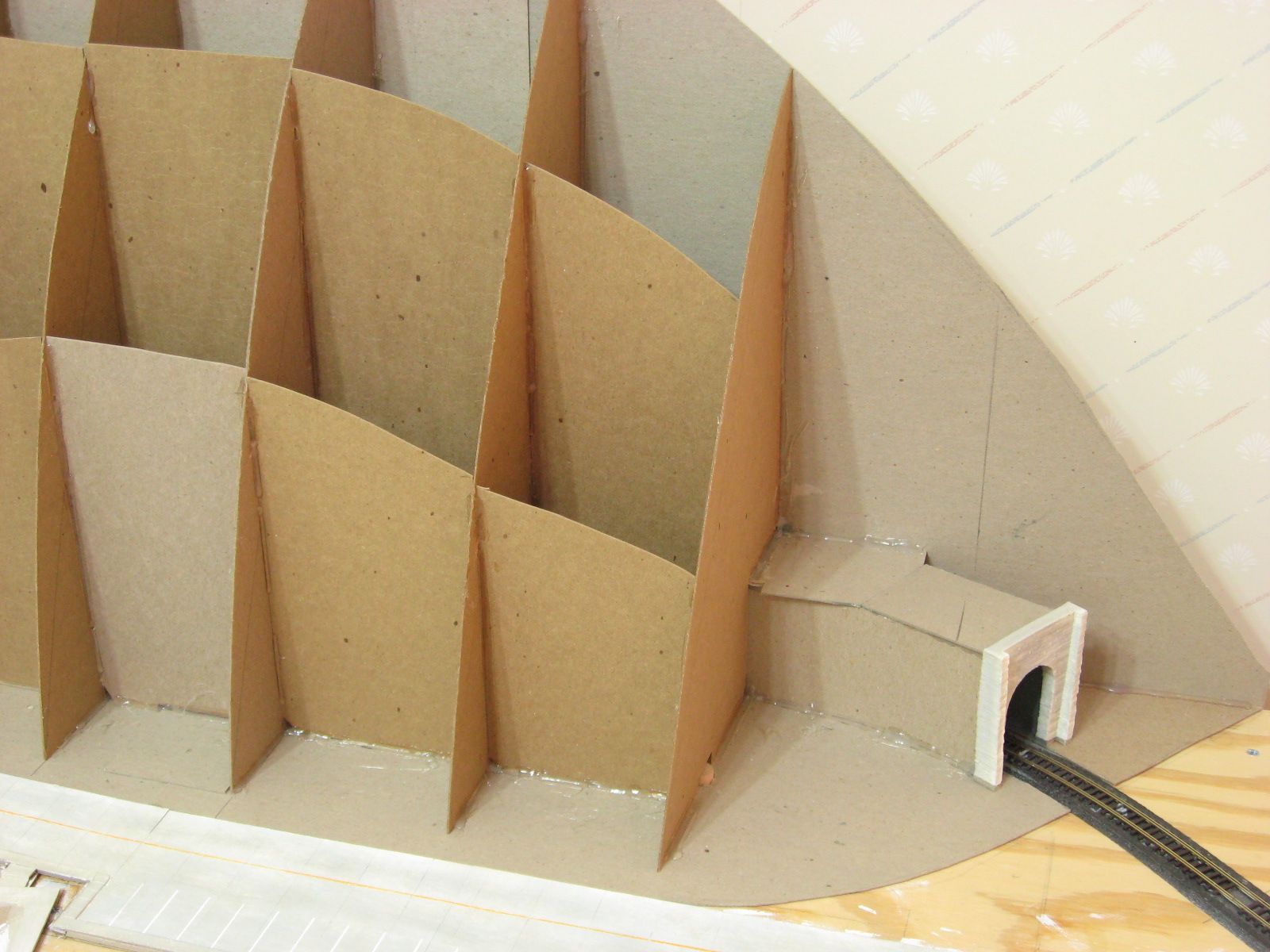 I cut out and attached cardboard pieces to either side of the tunnel portal that I will later use to attach abutments to. I added more pieces around the portal that will later be used to attach lattice pieces to and provide support for plaster cloth.