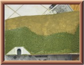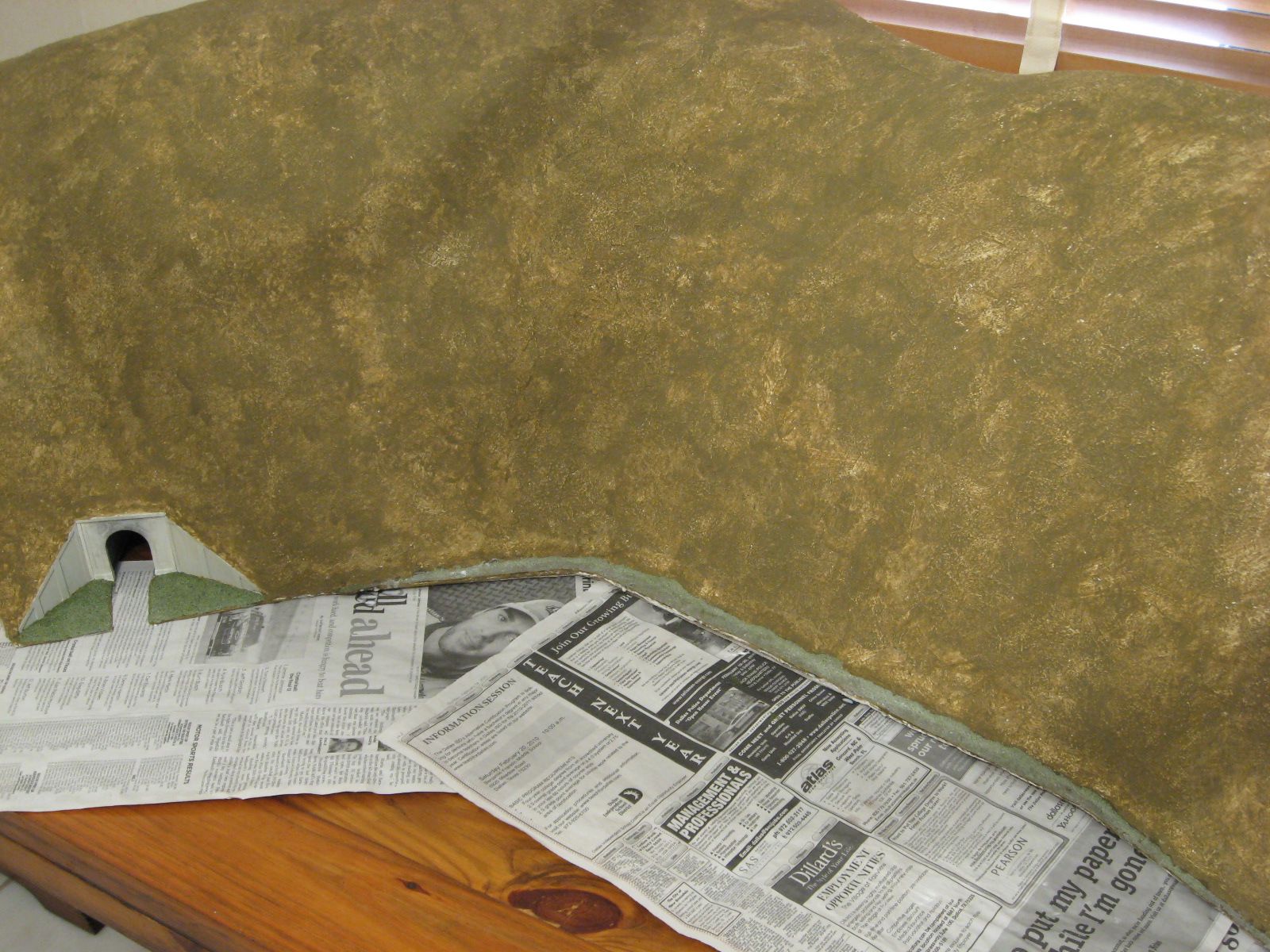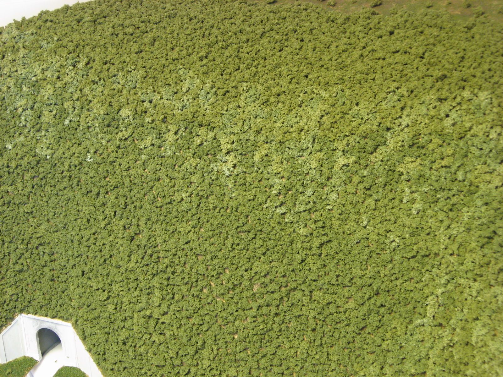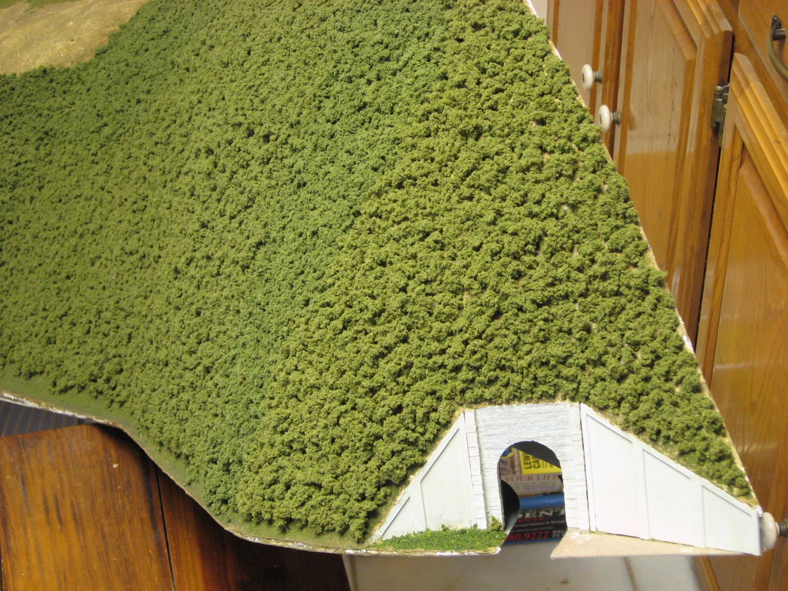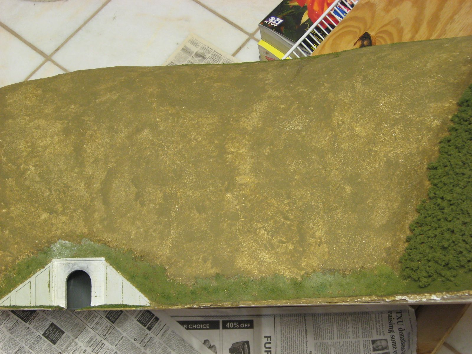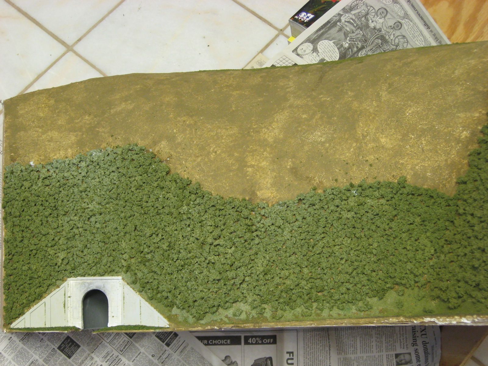 I moved the ridge to another orientation. I added burnt grass green turf along the bottom of the ridge and tunnel portal. I added more clump foliage.