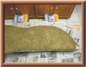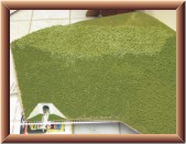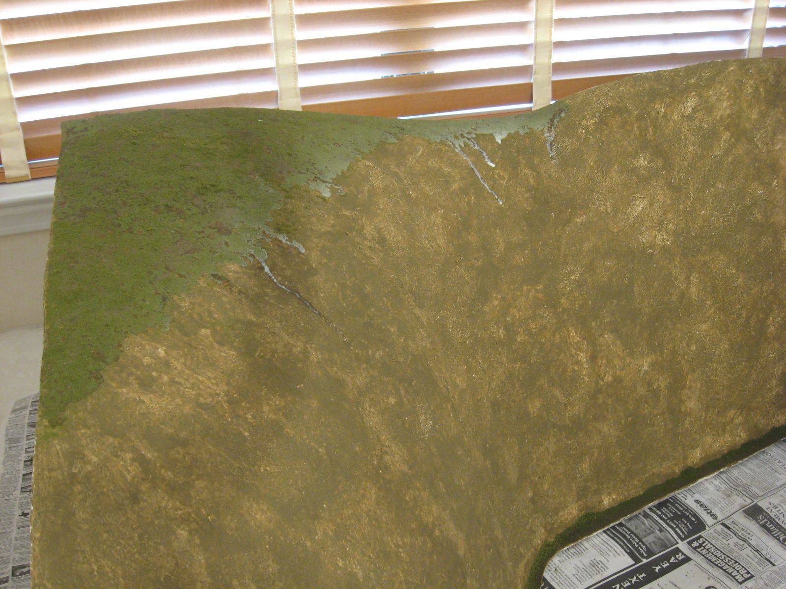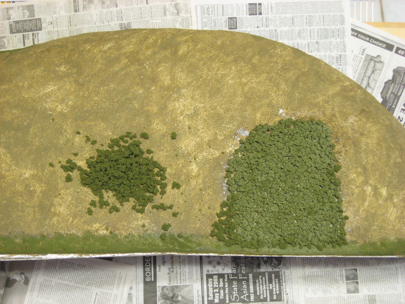 I continued adding the clump foliage along the area I could work in. If I added foliage to an area that was not level enough, it would just roll off. I would have to let the glue dry overnight before I could move the ridge again.