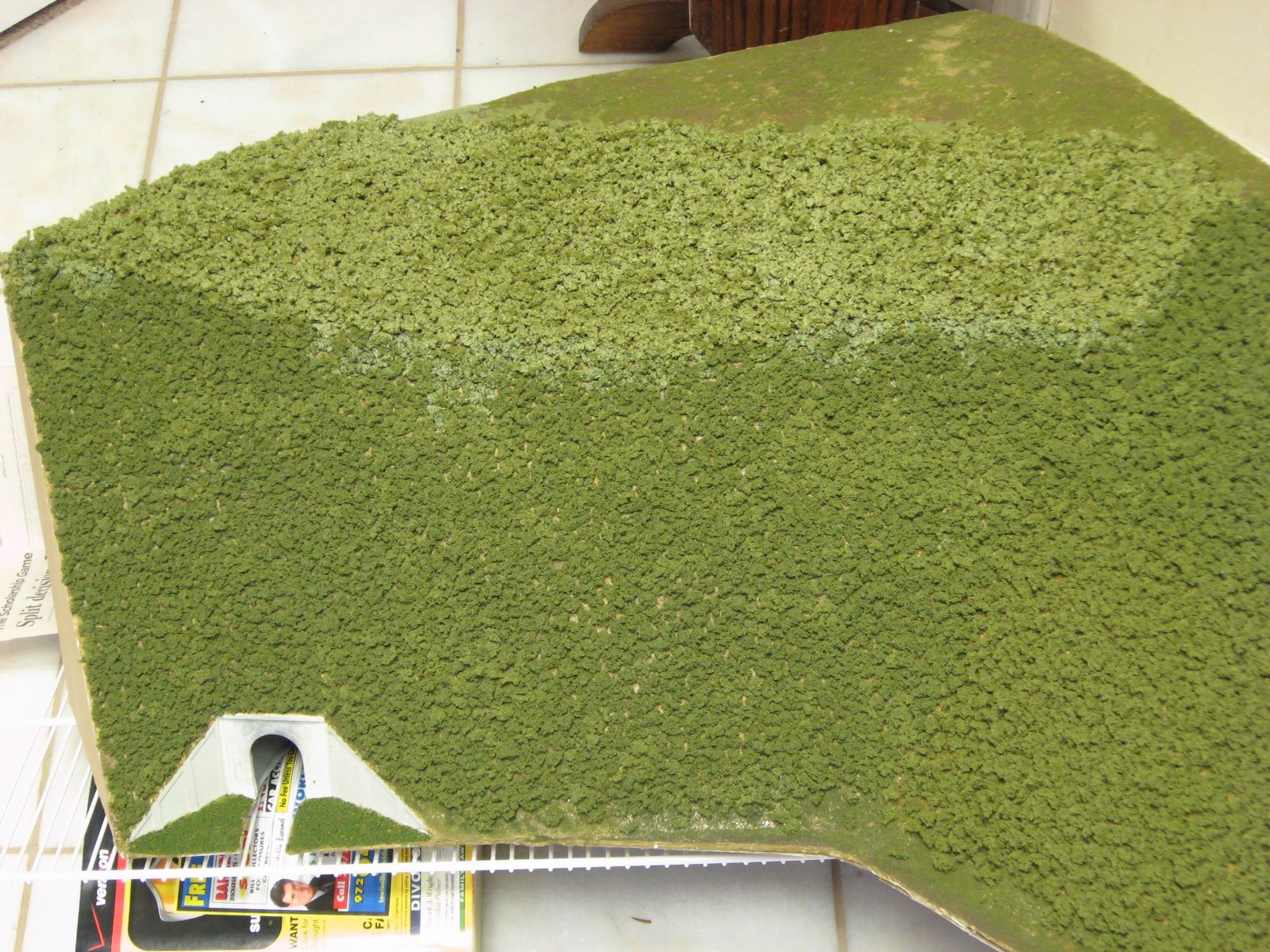 First, I set the ridge on my table to make it easier work on. I added a green blended turf at the tunnel portals. I added brown turf along the front edge of the ridge lip that will run along the road. Behind this, I added burnt grass and green blended turf. I glued all of this down with Scenic Cement.