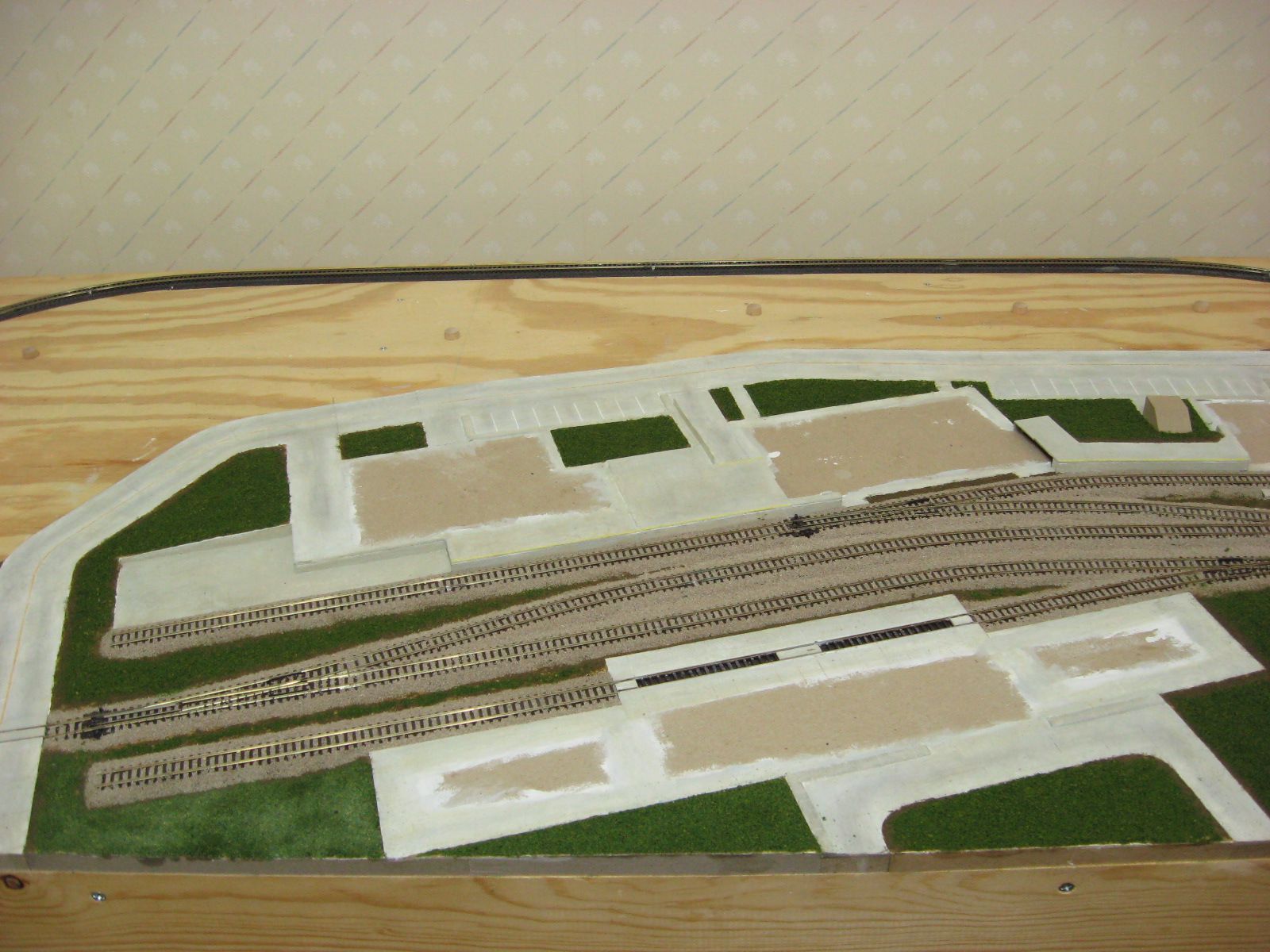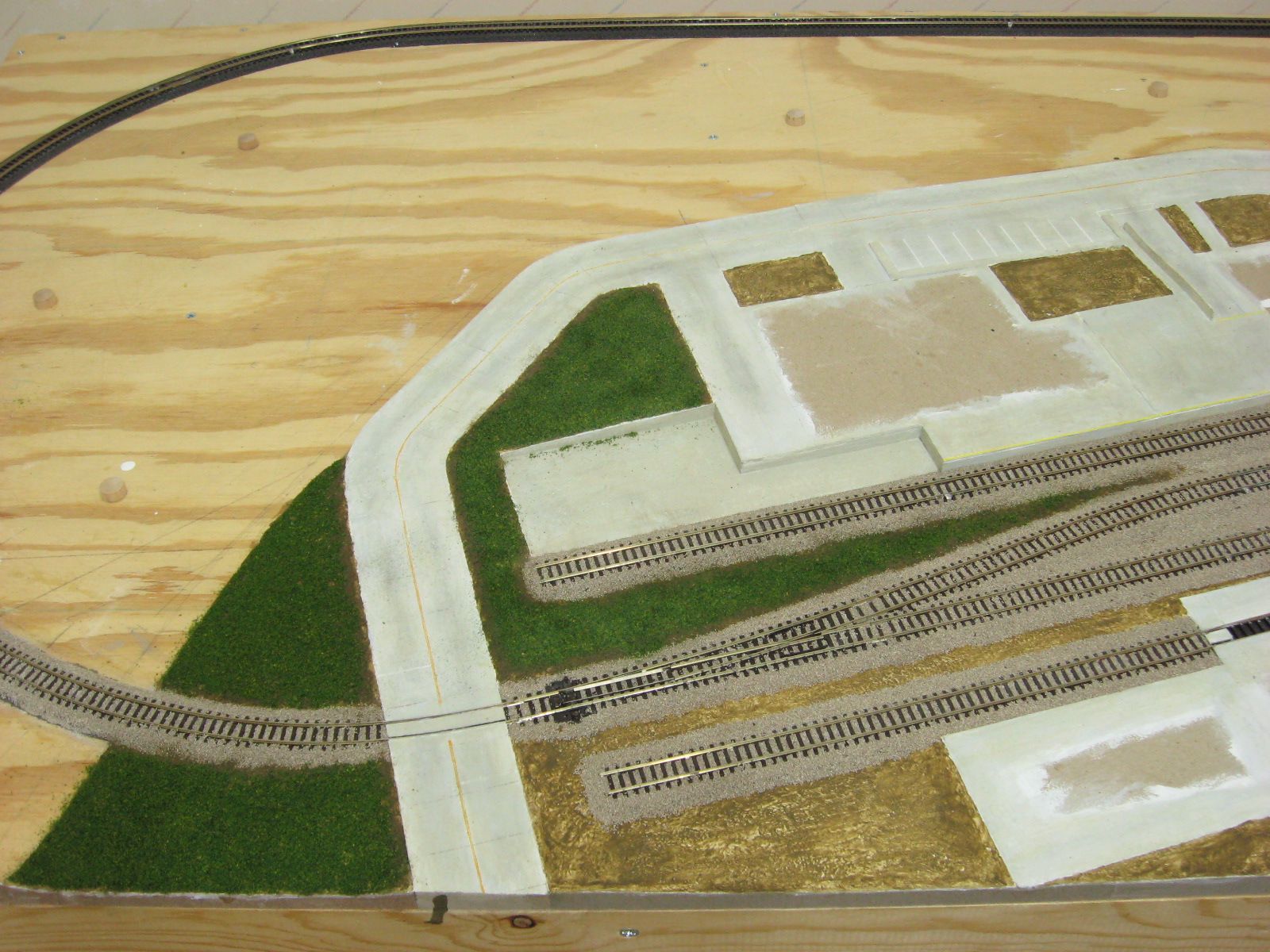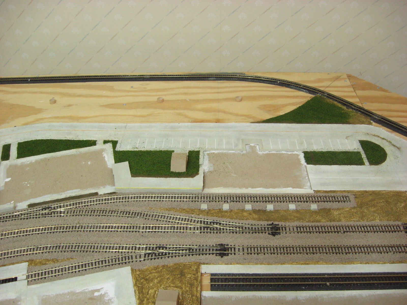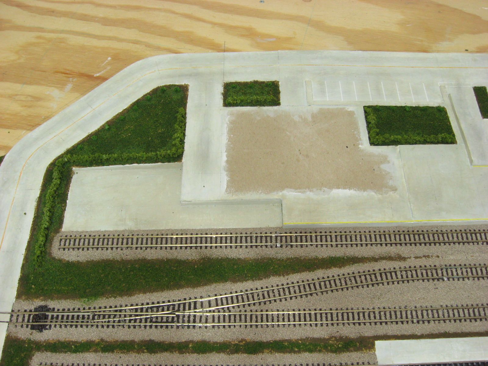 I laid down brown turf along the edges of the roads and ballast. I then applied blended green turf to the rest of the areas. I glued the turf down with Scenic Cement.