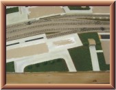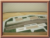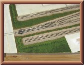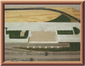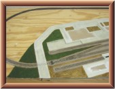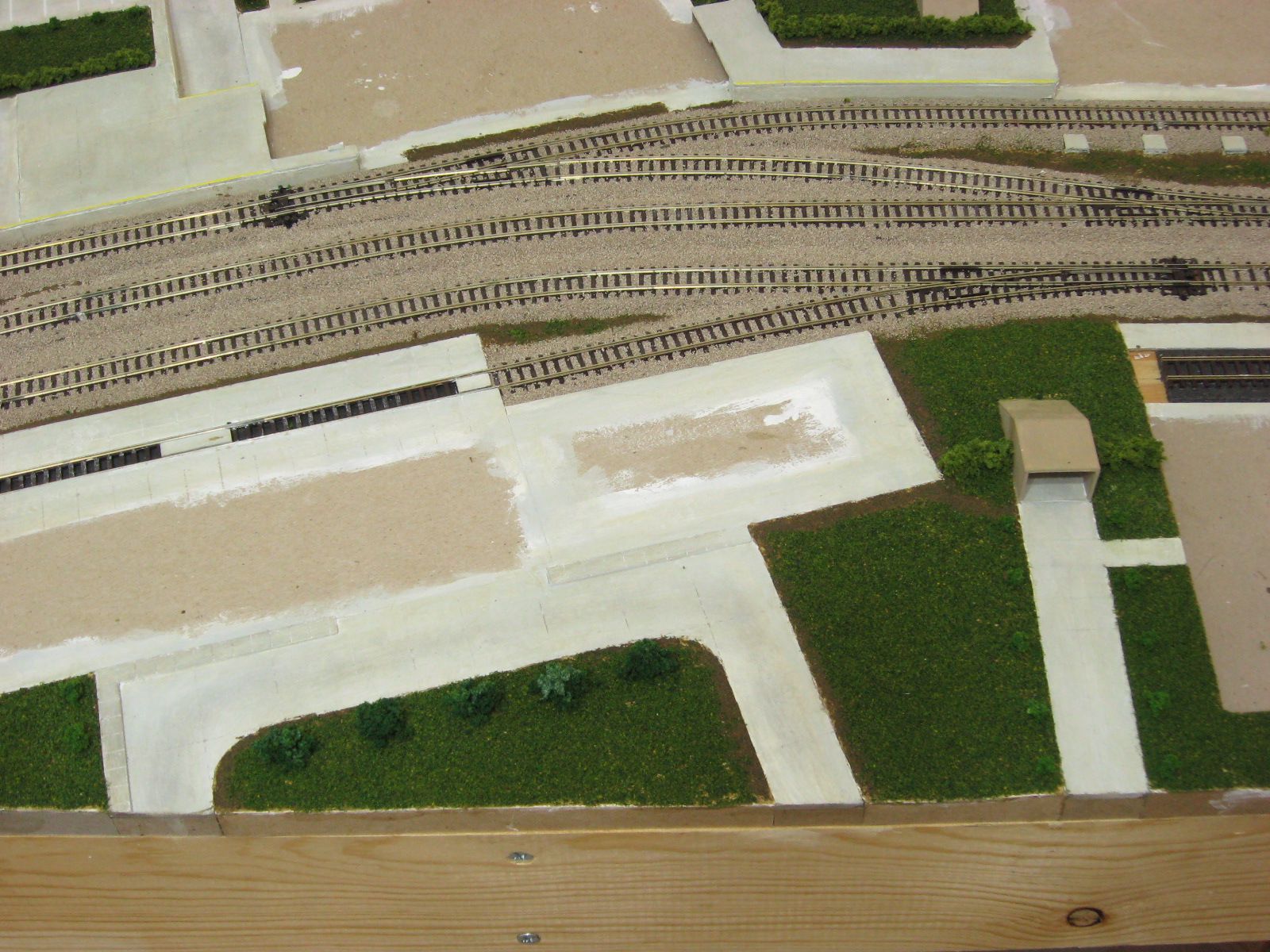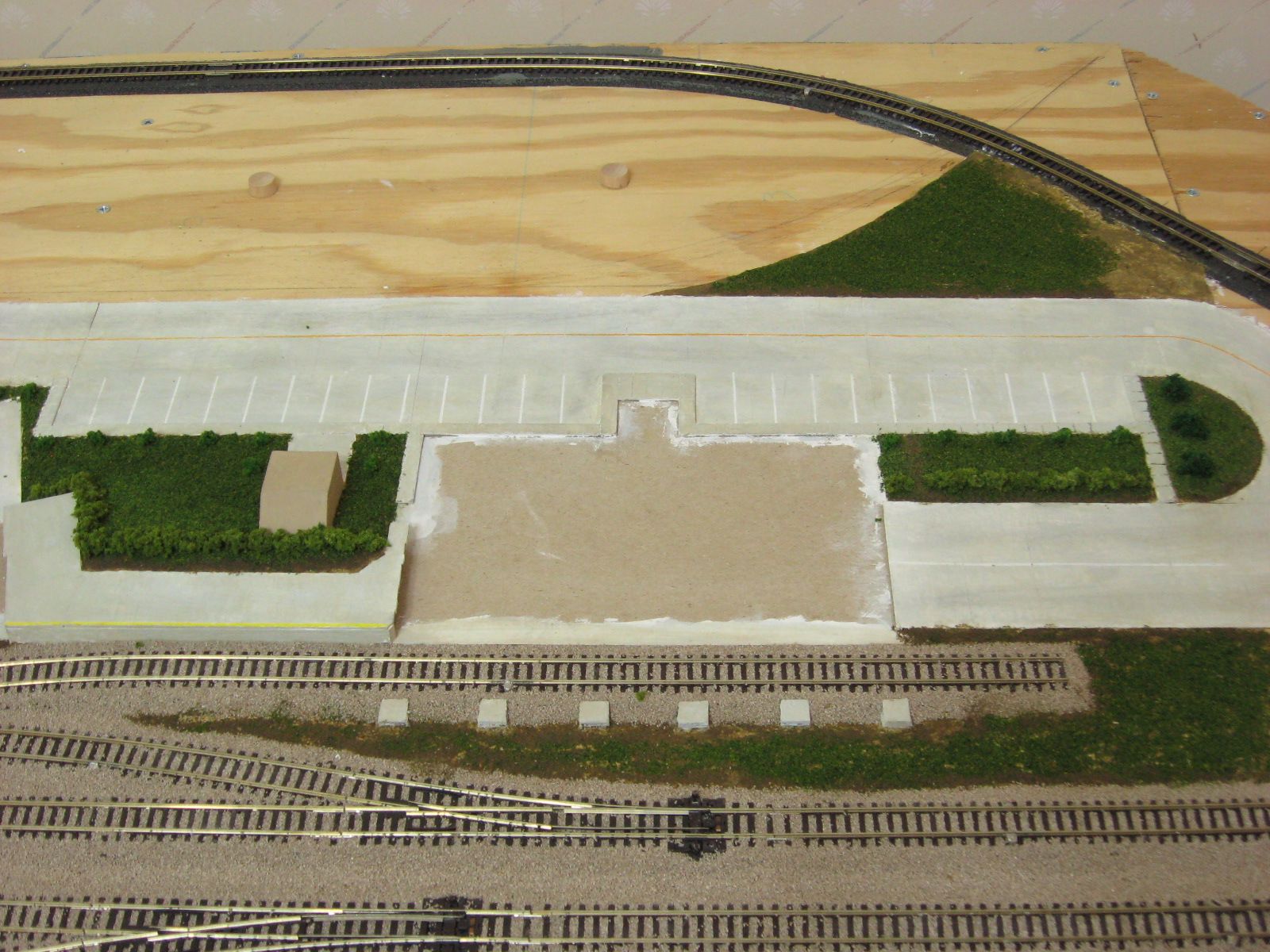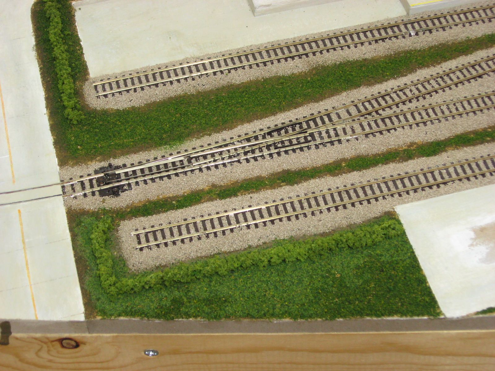 I laid down brown turf along the edges of the roads and ballast. I then applied blended green turf to the rest of the areas. I glued the turf down with Scenic Cement.