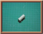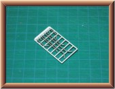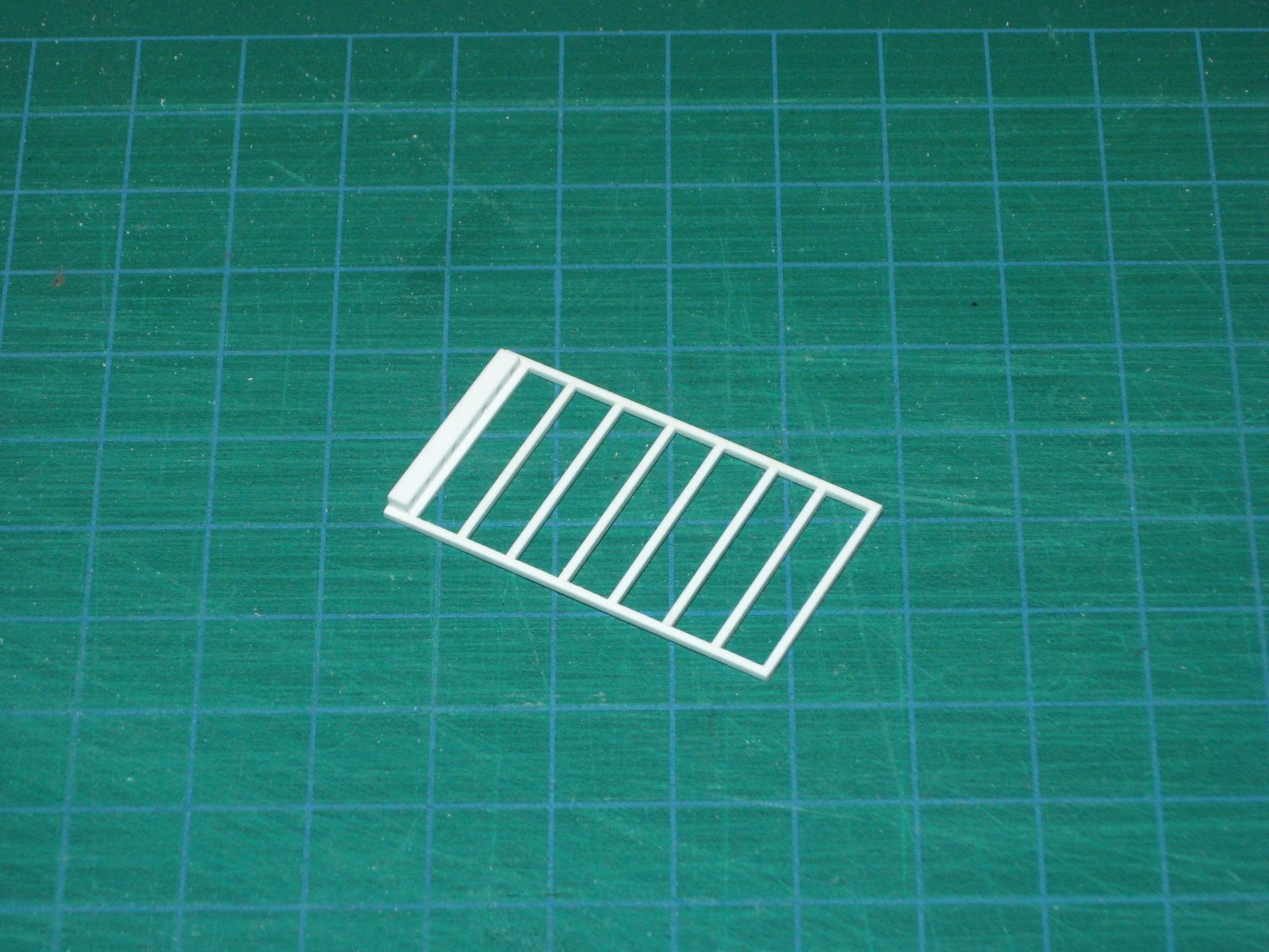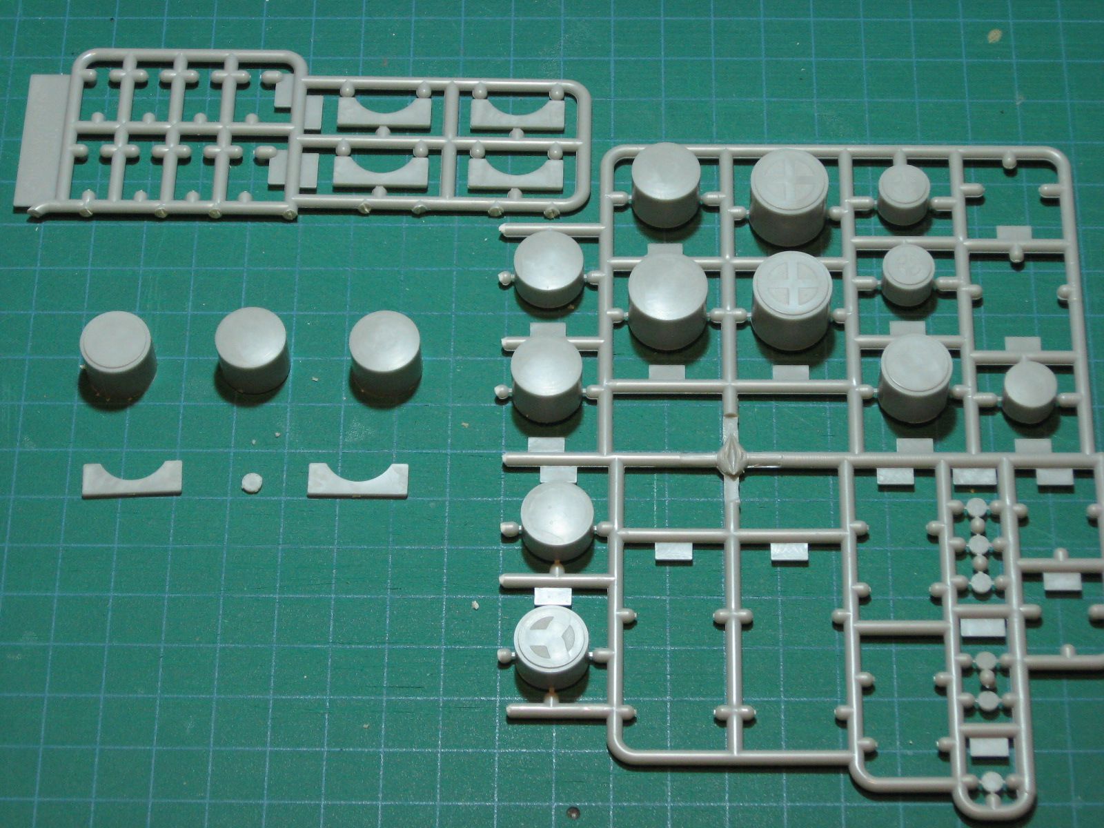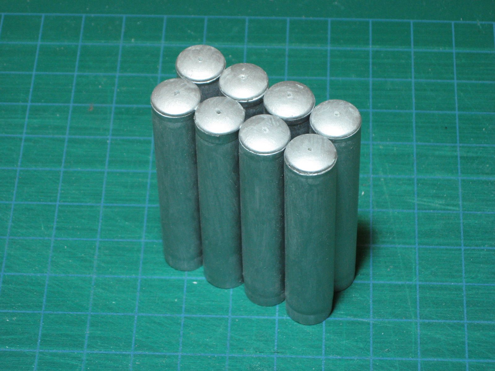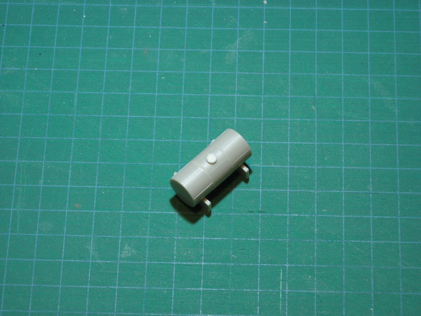 I found an odd shaped cap in my junk box that I could use for a cabinet. I scribed in door edges and handles. I drilled holes for pipes in the rear. I painted the cabinet light gray. I painted its roof dark gray. I bent bus wire to form pipes running from the cabinet to the tanks. I was going to run pipes out of the rear of the tanks, but decided not to. The rear pipes would not be that visible from the front.