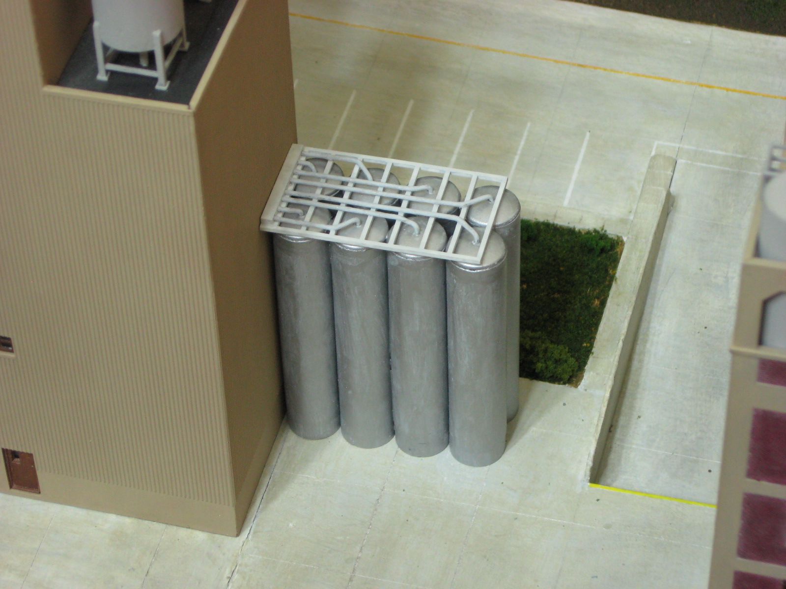 I attached the tanks together to form one unit. I painted the unit gray. I then painted the base structure concrete. I drilled holes for piping.
