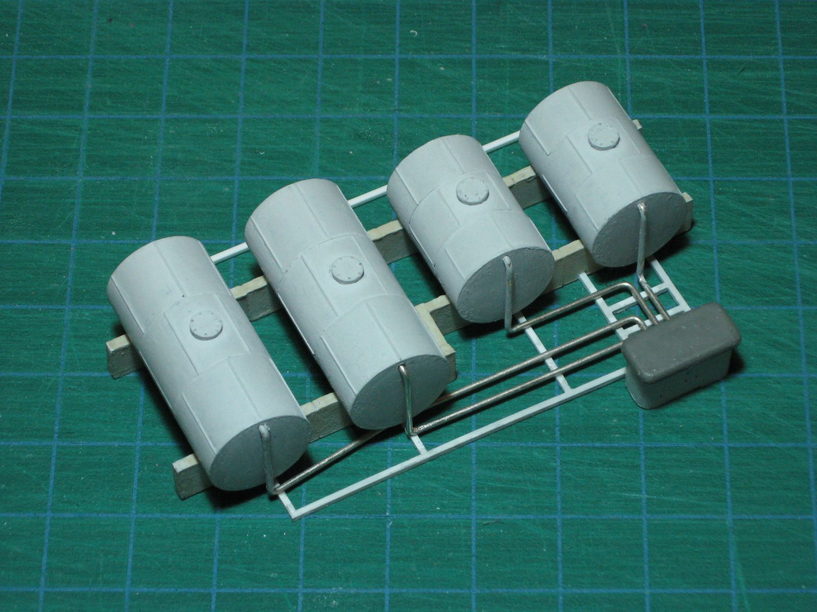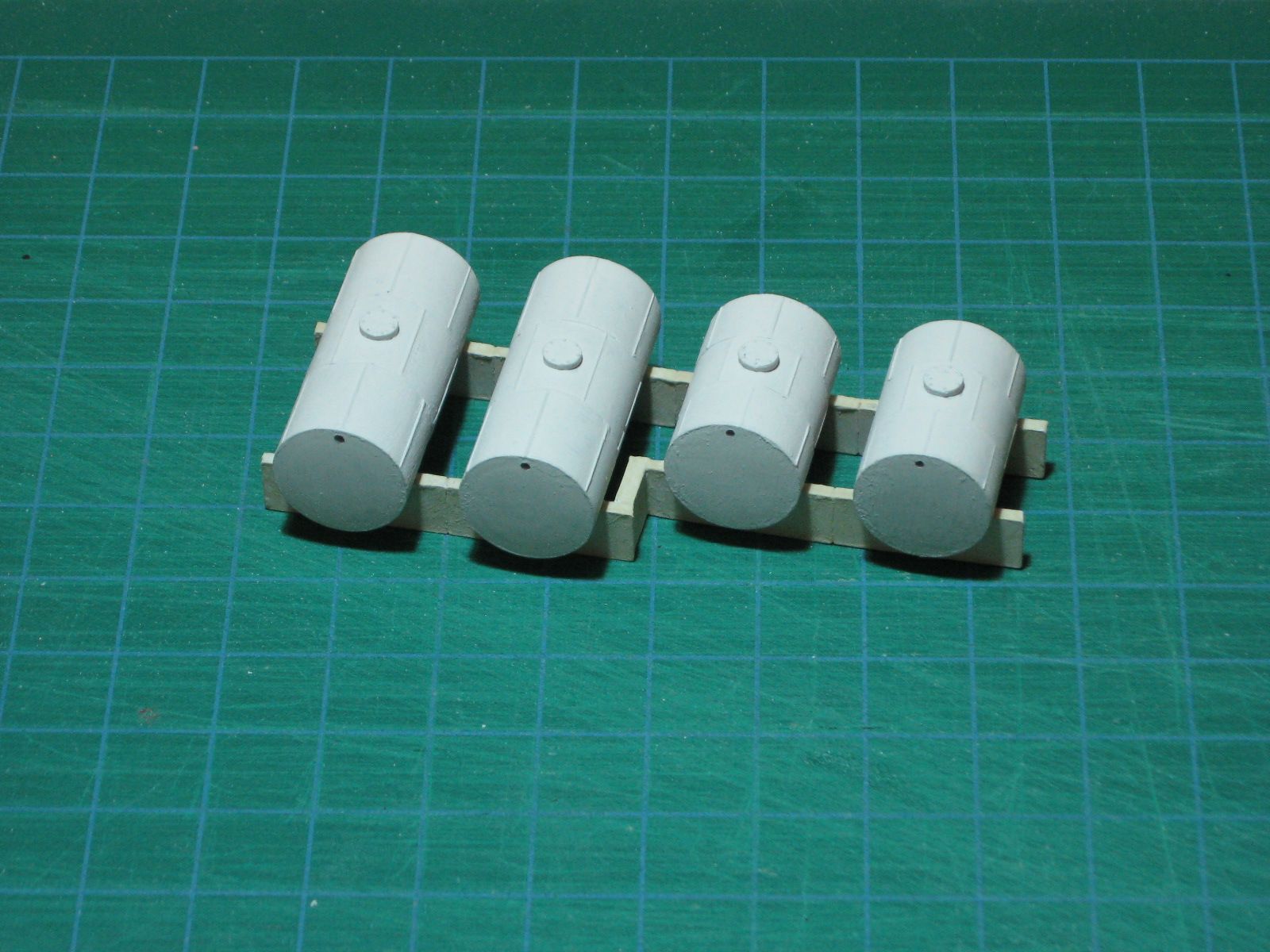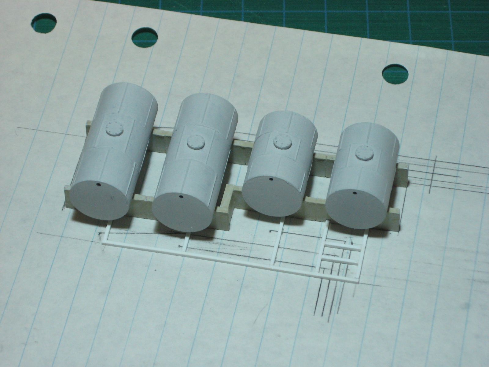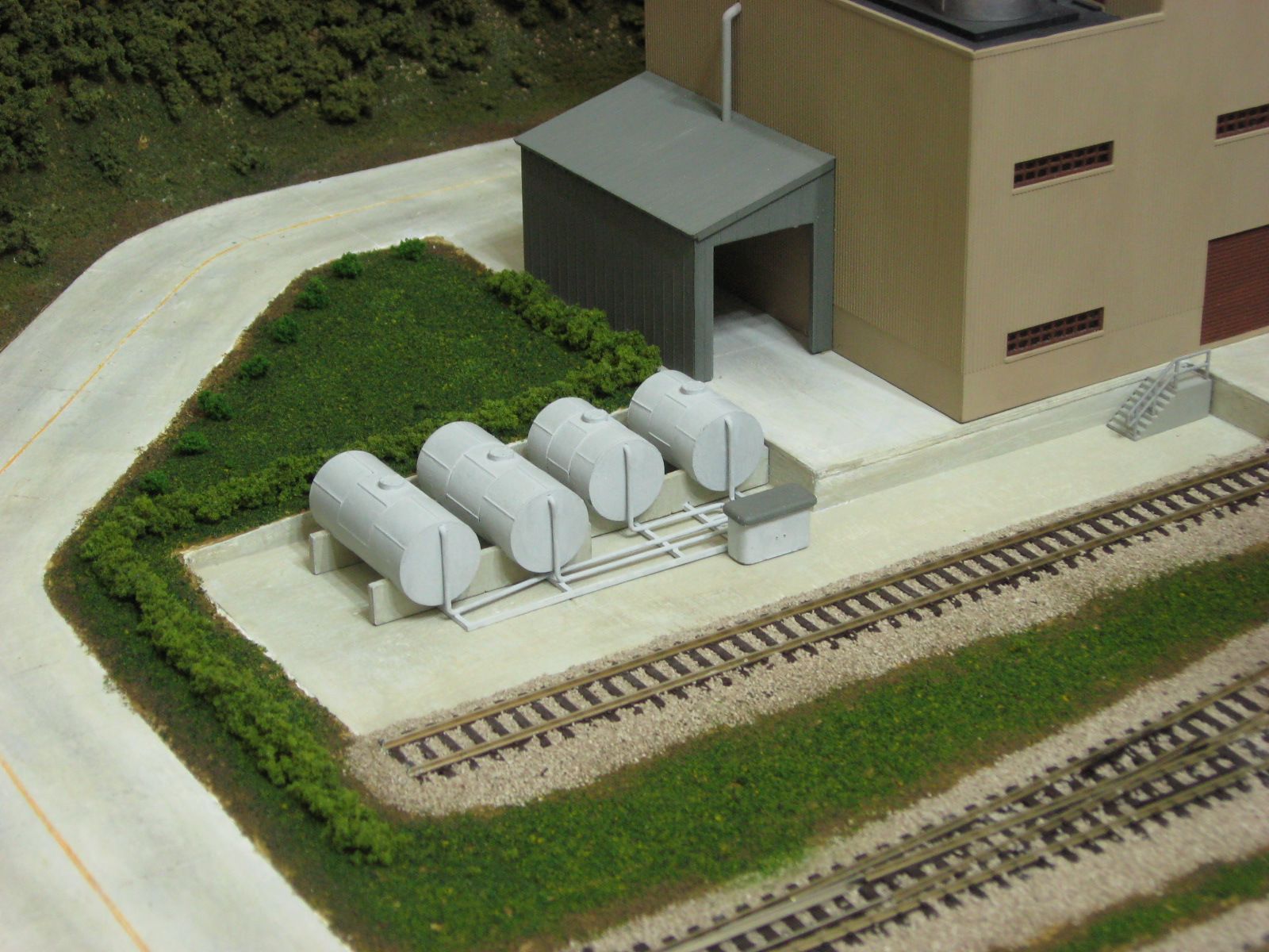 I still had some tanks leftover from the two Walther�s storage tanks packs. I decided to use four of them to create horizontal tanks that would be filled from tank cars.