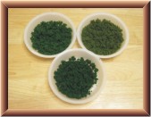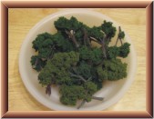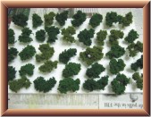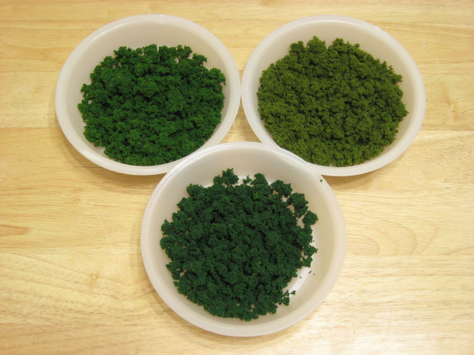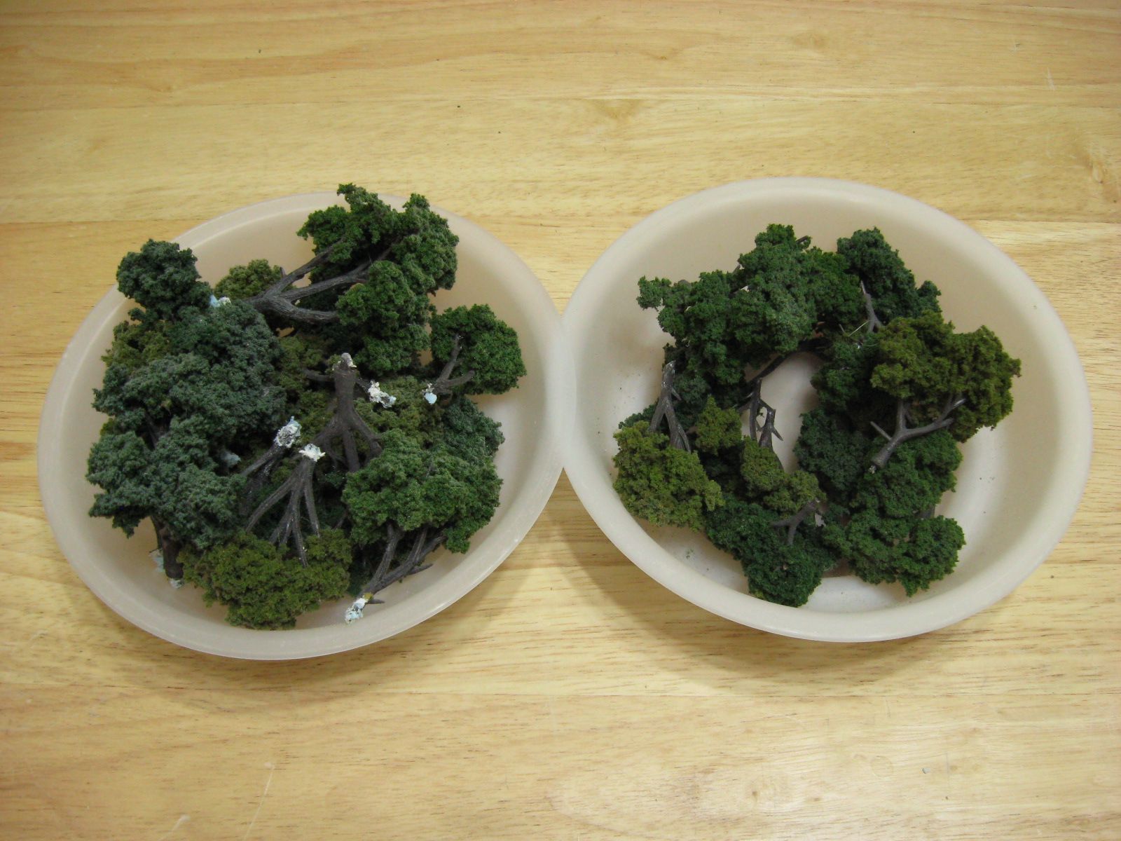 The next phase was adding foliage to the trees. For about fifteen to twenty minutes I would apply Hob-e-Tac glue to branches of multiple trees. At the end of that time period, the first tree would be tacky enough to work with. I would roll the tree in one color of foliage and then poke it in to a styrofoam base for drying. Later, I sprayed each tree with hair spray to firm up the foliage. I had to repeat this process on some trees due to foliage falling off while drying.