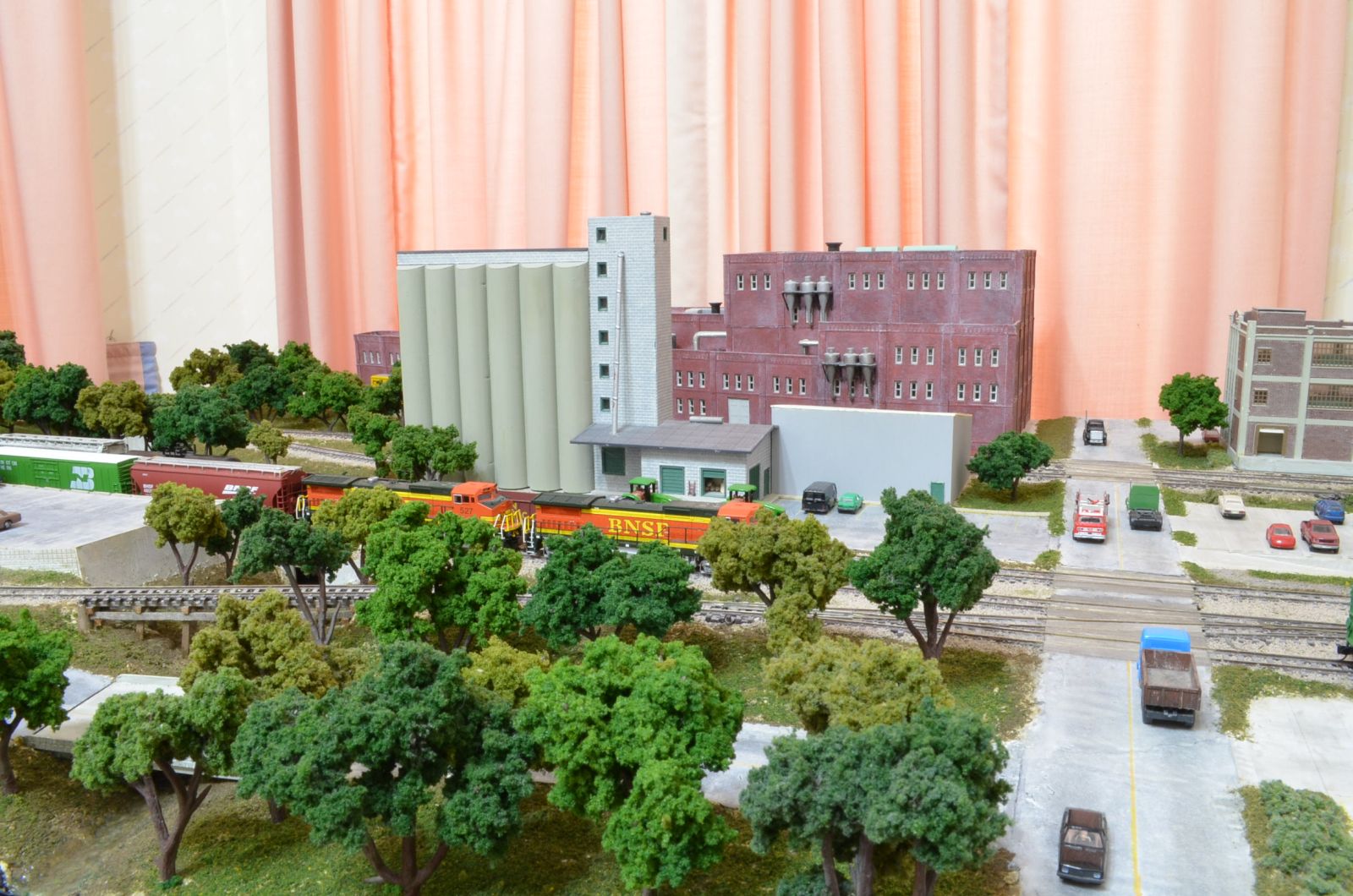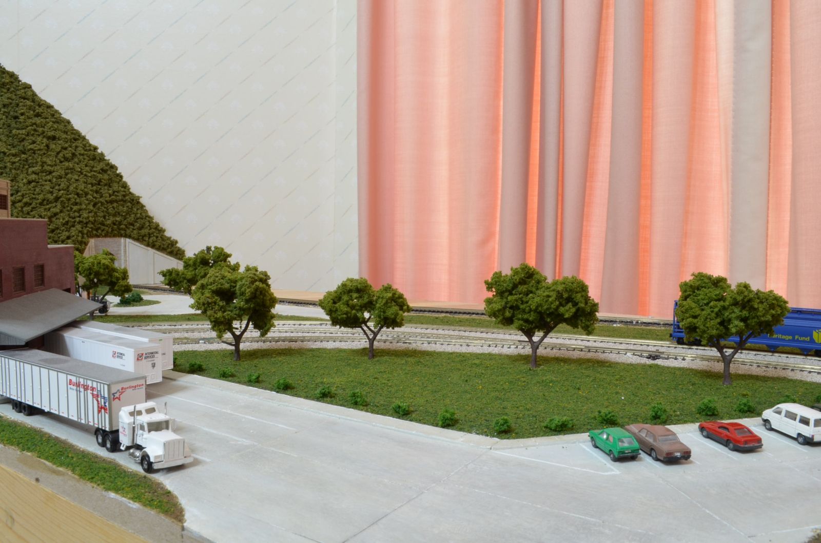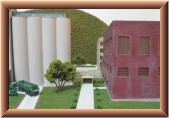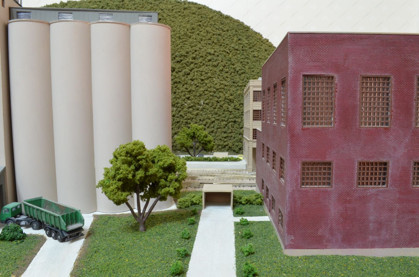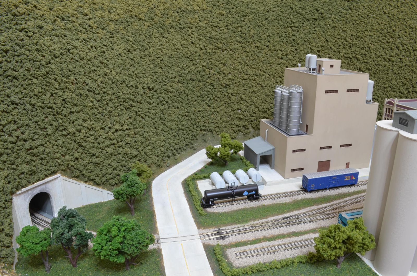 I started planting trees around the brewery complex first. I picked some trees that were the same color. I wanted it to look like the brewery landscaper planted these trees. I hand drilled holes into the ground. I placed some glue in the hole and then added the tree. I placed some random trees next to the tunnel portal. I held off adding trees to the back of the corner module. They might get in the way when I add the final industry.