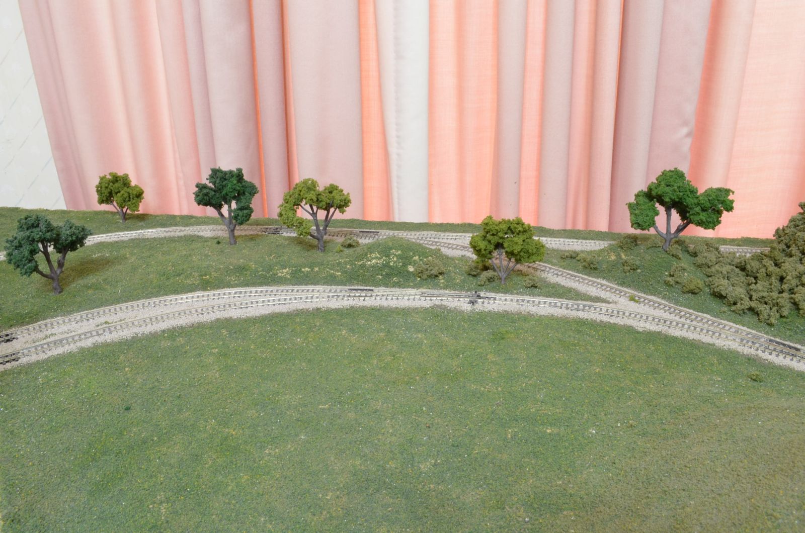 I planted a few of the reconditioned trees along the back of the second corner module. I will have to make some more trees to add later. I am not going to plant trees along the front at this time. I want to add some kind of scene here. I added trees to the hill and the front of the end loop. I tried to decrease the tree height as I went up the hill to add some forced perspective. I have started making another batch of trees to plant in some remaining areas.