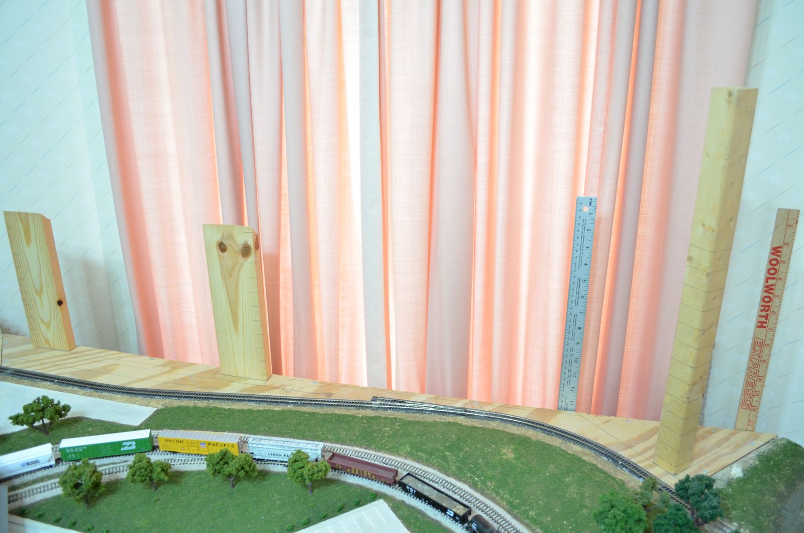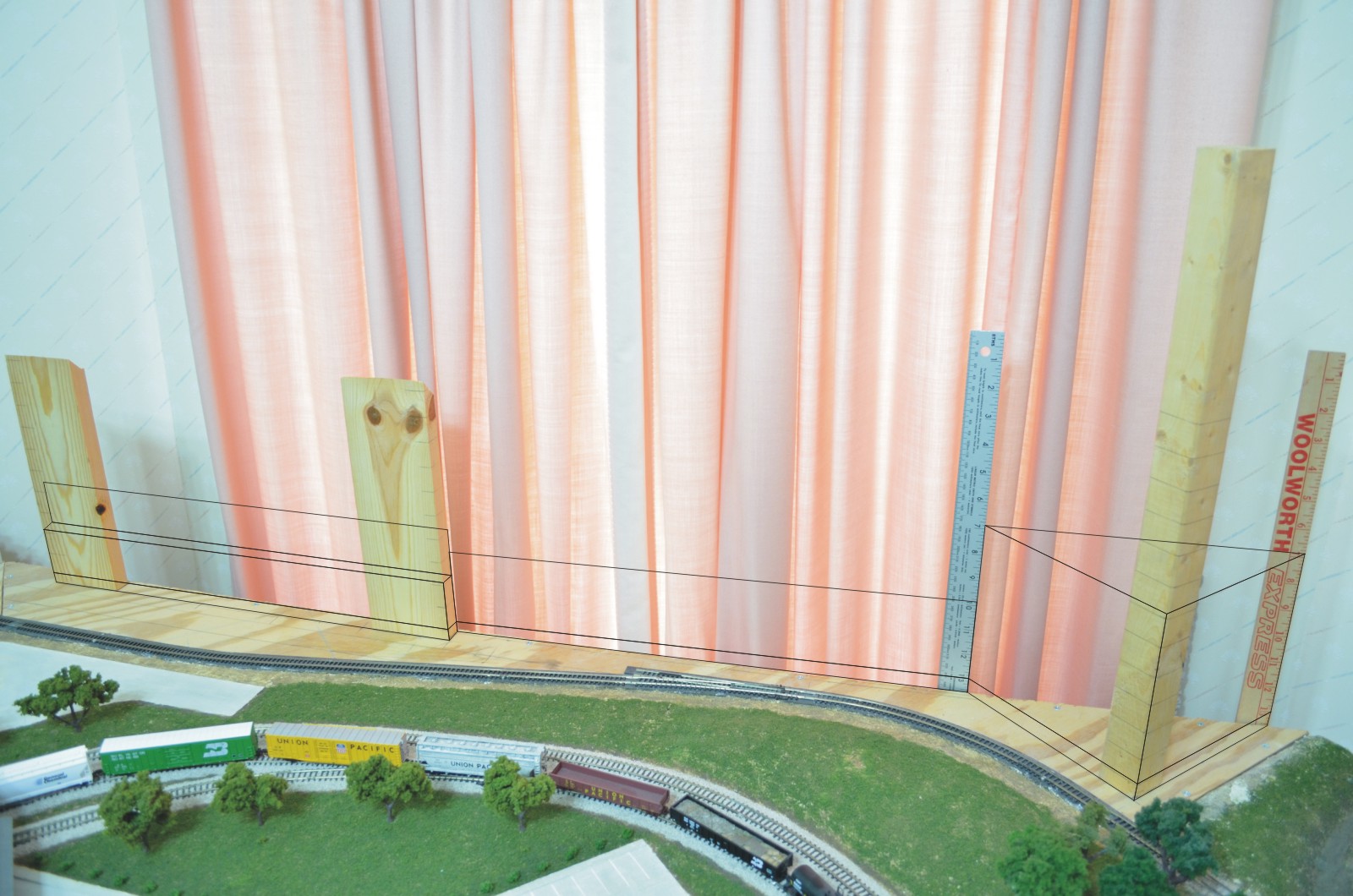First, I marked the building perimeter on the module. I decided to add an office area on the right side of the building that will angle out from the backdrop. On the left side, I pulled the dock area out a little from the back. Next, I placed risers containing measurement markings at key locations to help design the building. I photographed the location and imported it into a graphic design application.