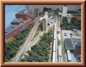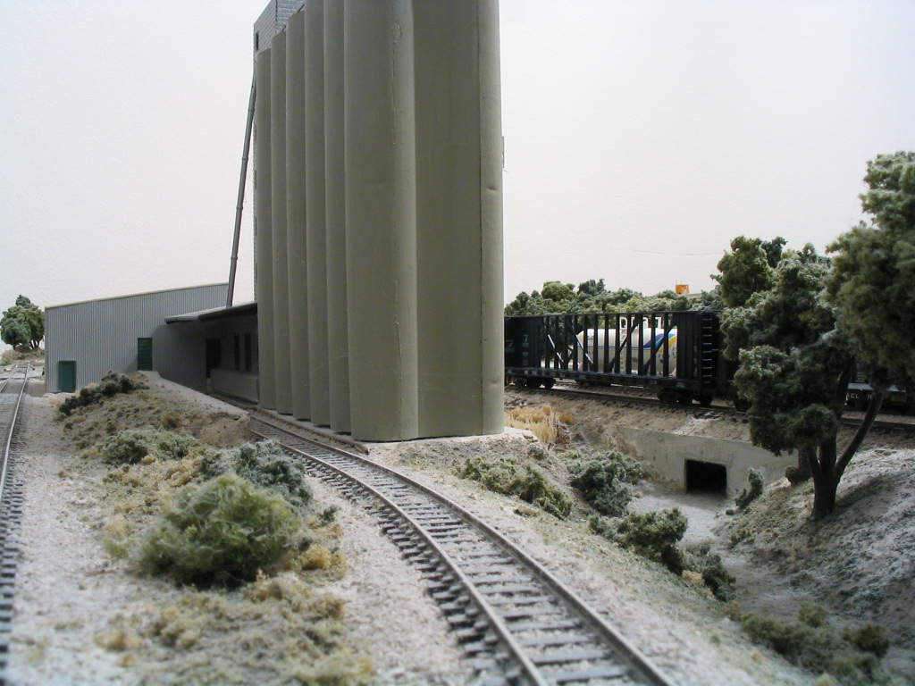 Sculptamold was next used to build up all areas not already covered with roads, foundations, or tracks. Sculptamold is a dry power that mixes with water just like plaster. It dries slower than plaster allowing more time to work with it. When the ground was dry, it was painted with an earth tone wash using acrylics. Various colors and types of ground foam were then applied to the ground using watered down glue.
