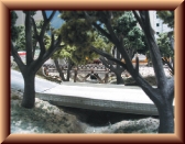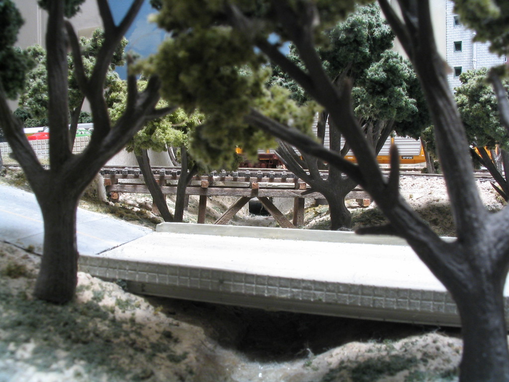The creek trench was formed earlier when the foam was being carved. The foam was carved all the way down to the surface of the plywood. The exposed plywood was painted with dark earth tones to simulate the bottom of the creek. Many coats of gloss medium were painted on top to create the water. I could not use resin to make the water because it would have eaten through the foam. I also did not want the surface of the creek to be any higher. I formed the cement retaining walls and culverts out of painted styrene. I had to create two bridges to cross the creek. The road bridge was constructed from scratch out of sheet styrene. The wood trestle was built under the existing track out of painted balsa wood.